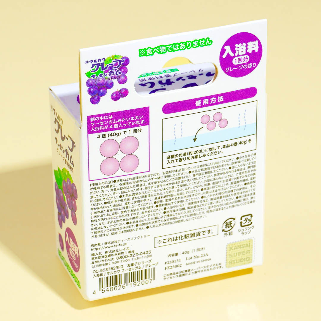Have fun playing in the tub with this box of bath balls! Its packaging resembles the packaging of Marukawa Grape Fusen Gum. Each of the grape-scented bath balls look just like gum too!