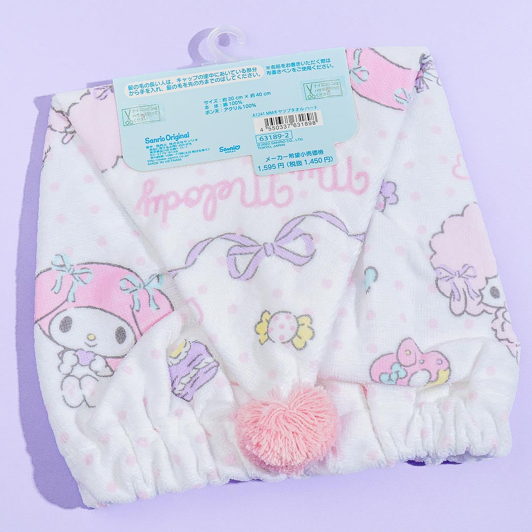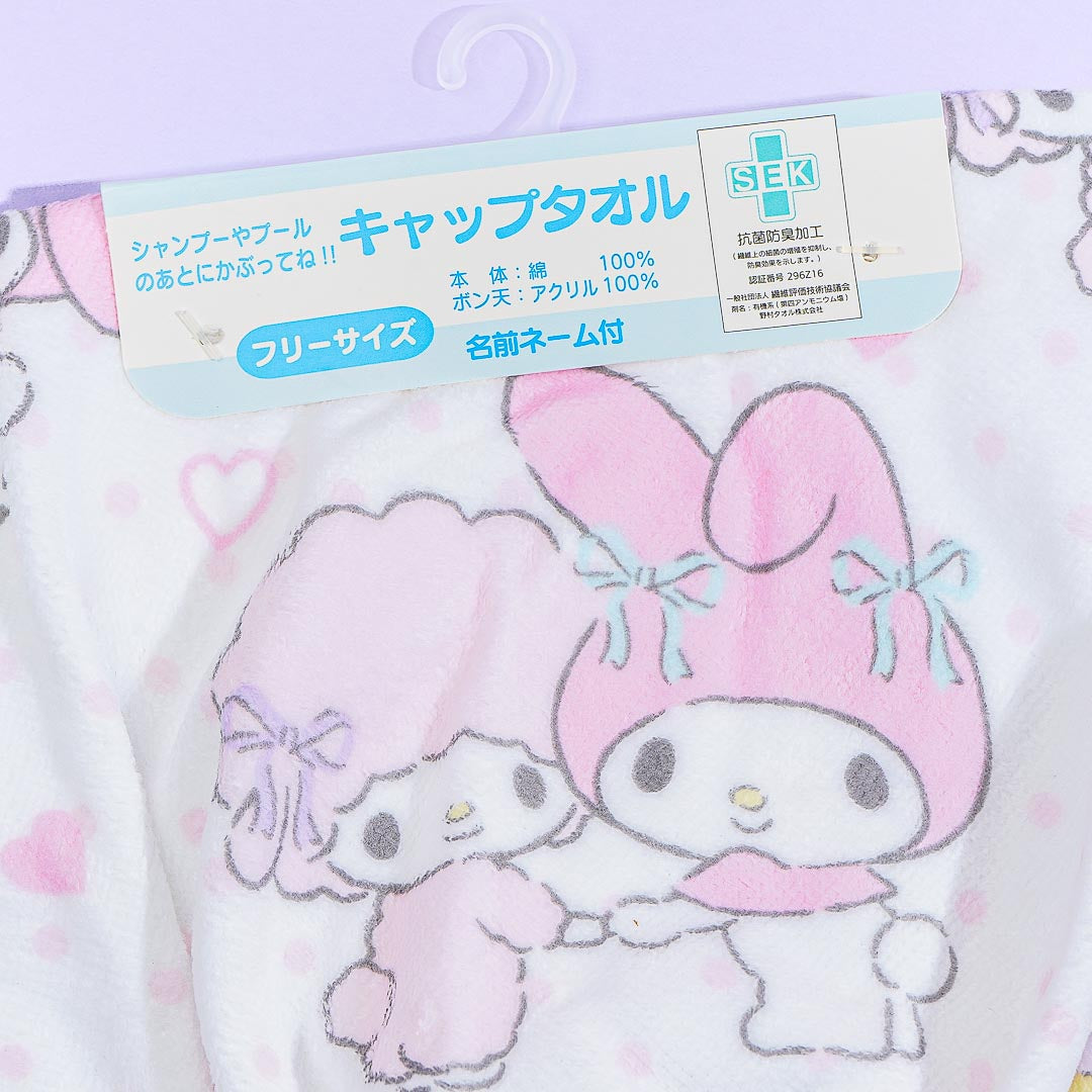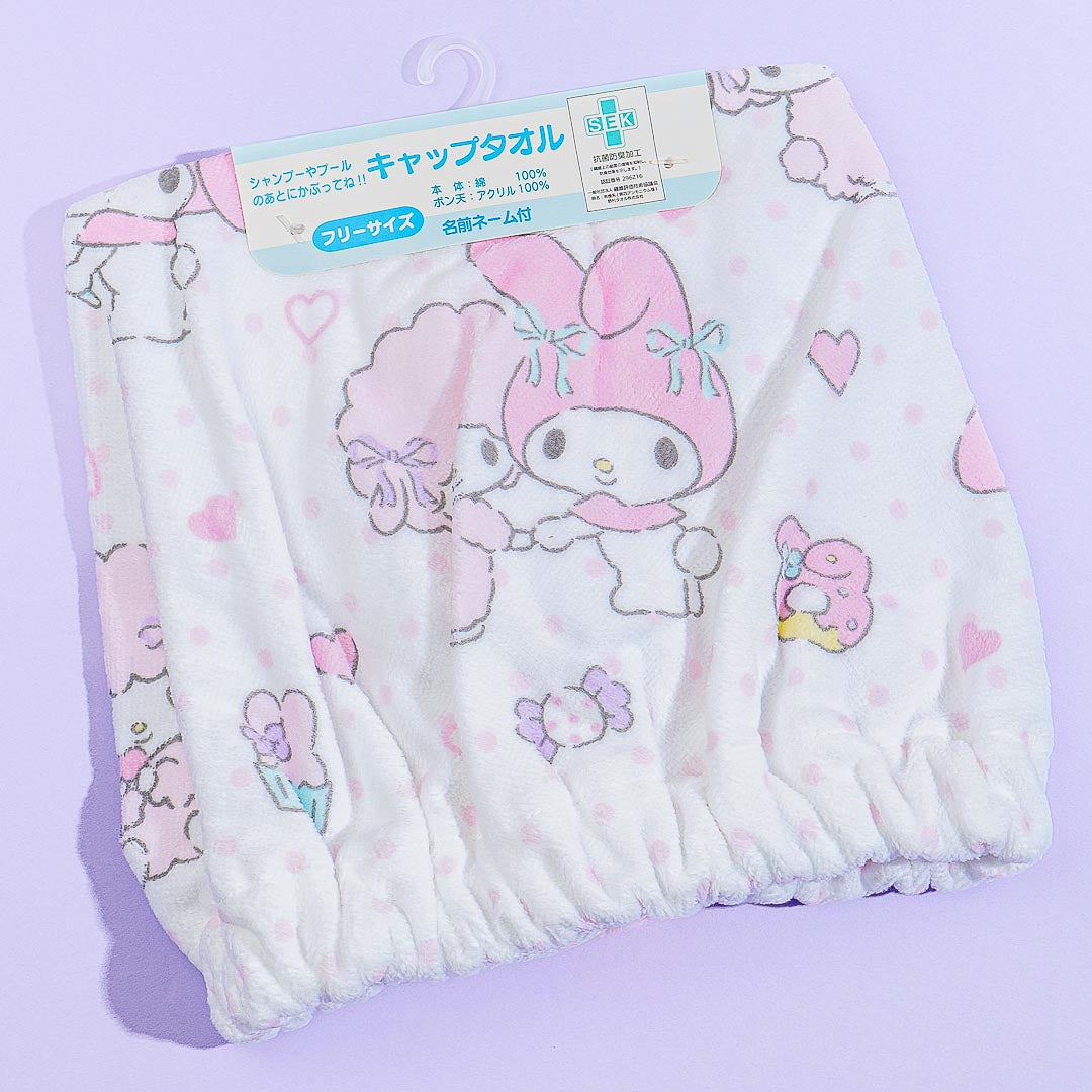 This kawaii pointed towel cap features super cute illustrations of My Melody holding hands with her bestie, My Sweet Piano! Use this to quickly dry off your hair after a quick swim or shower! It’s made from water-absorbent material that easily catches moisture.