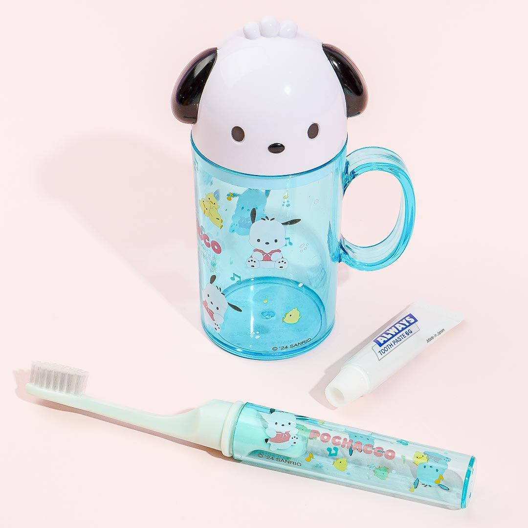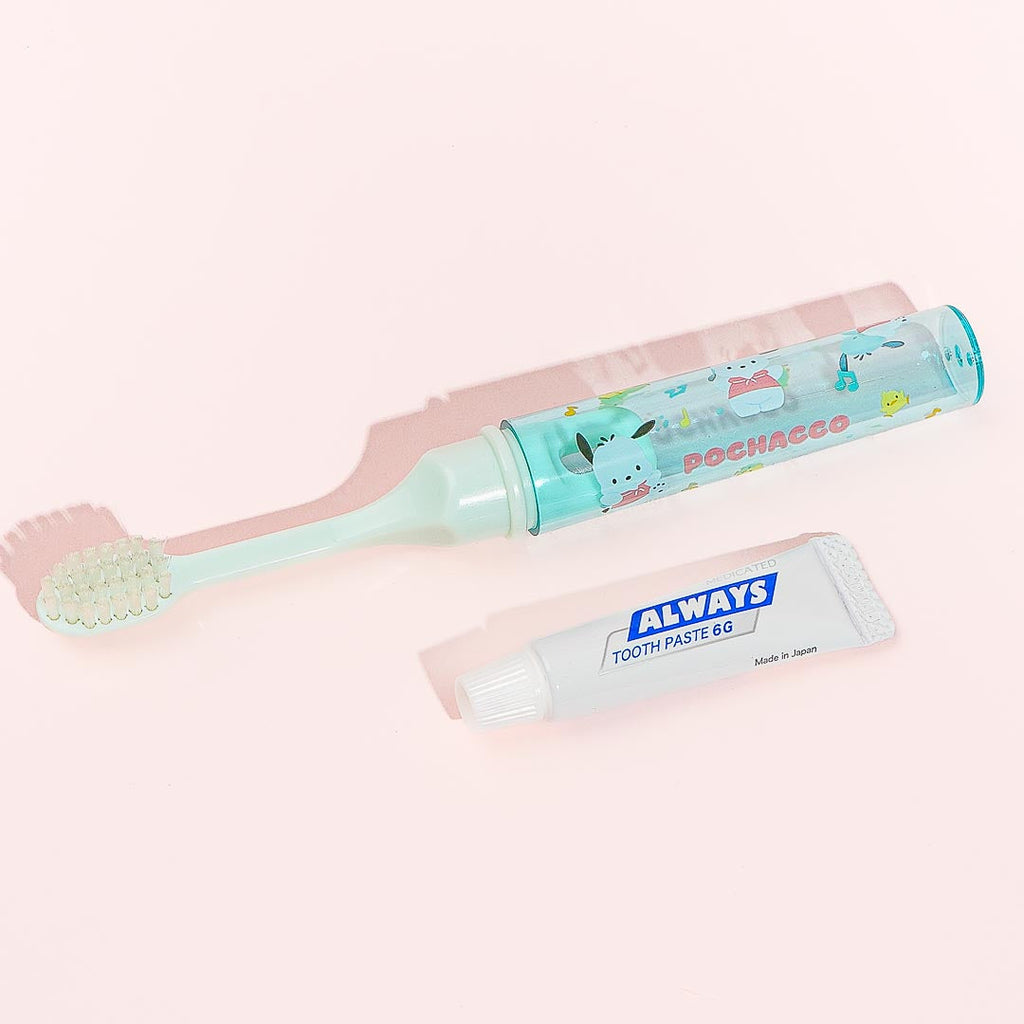 You can brush your teeth and keep your mouth fresh anytime and anywhere with this compact toothbrush set! It comes in a cute case with a lid that's shaped like Pochacco's head. It's also decorated with prints of Pochacco and musical notes.