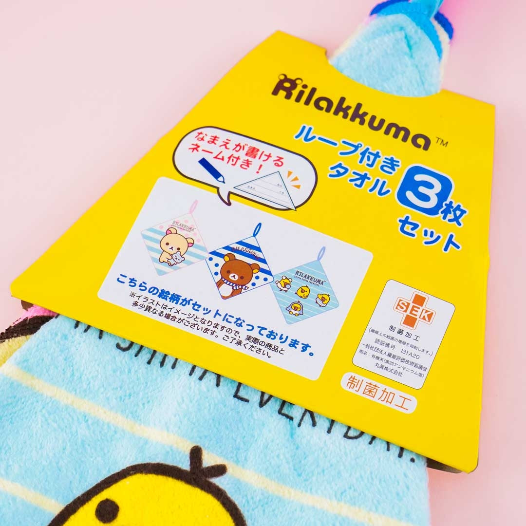 Keep yourself dry with this super kawaii set of striped towels. They showcase prints of Rilakkuma and his friends! Each cotton towel has a namespace on the backside so that you won't lose it as easily.