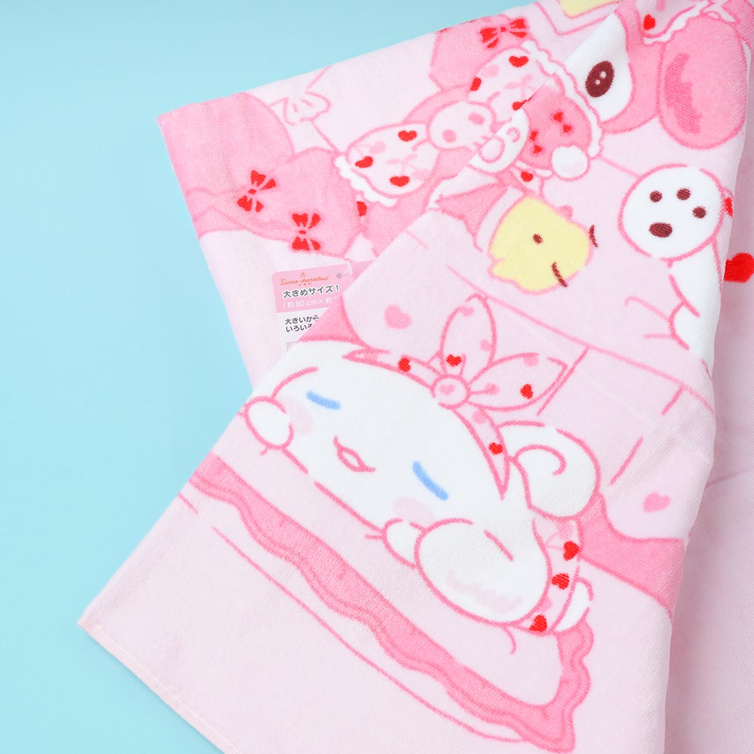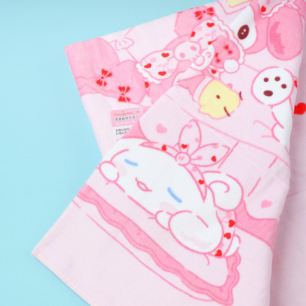 Use this kawaii bath towel after a refreshing bubble bath. The towel is the perfect size to use for your whole body. It features a cute illustration of the Sanrio characters wearing heart-patterned pajamas at a hotel.