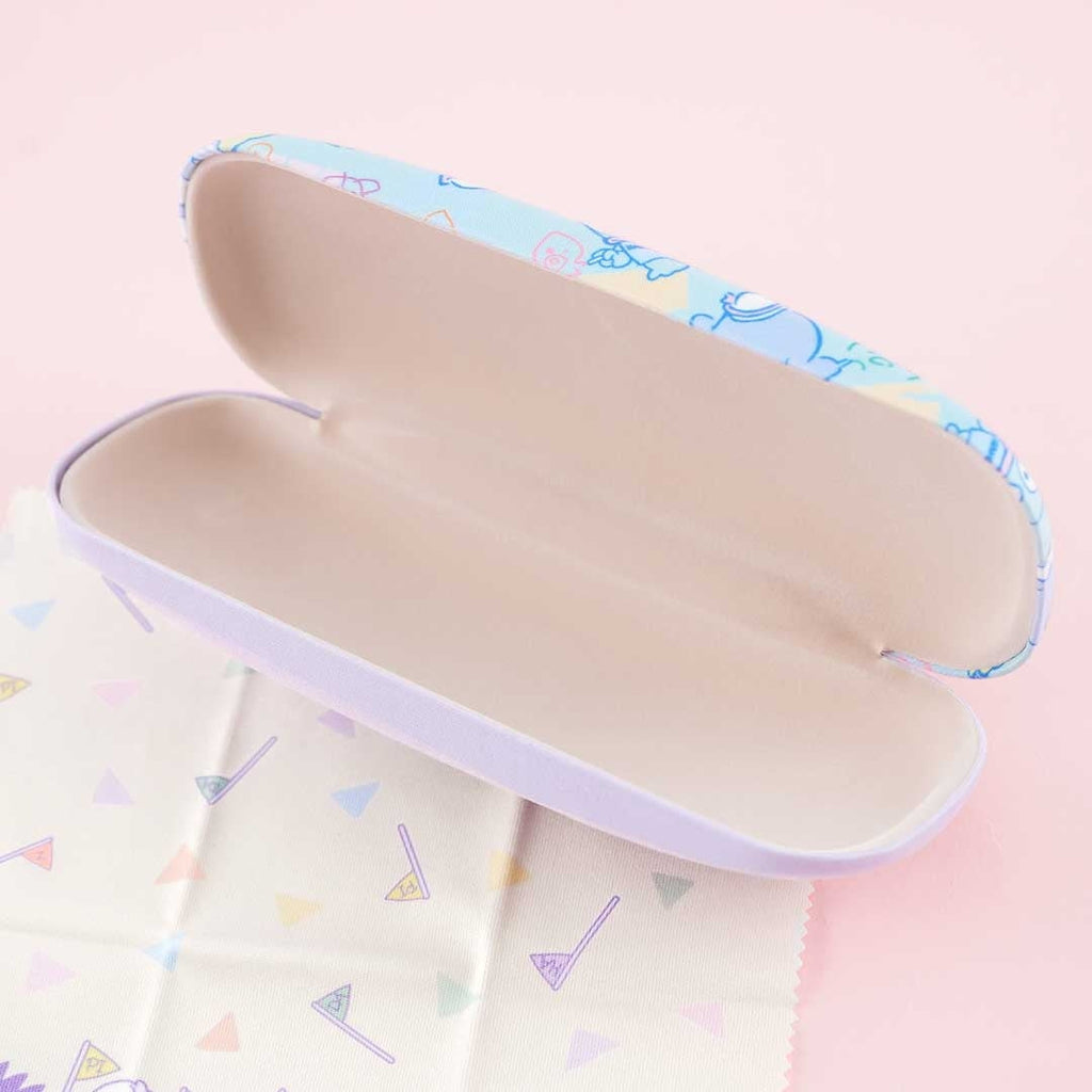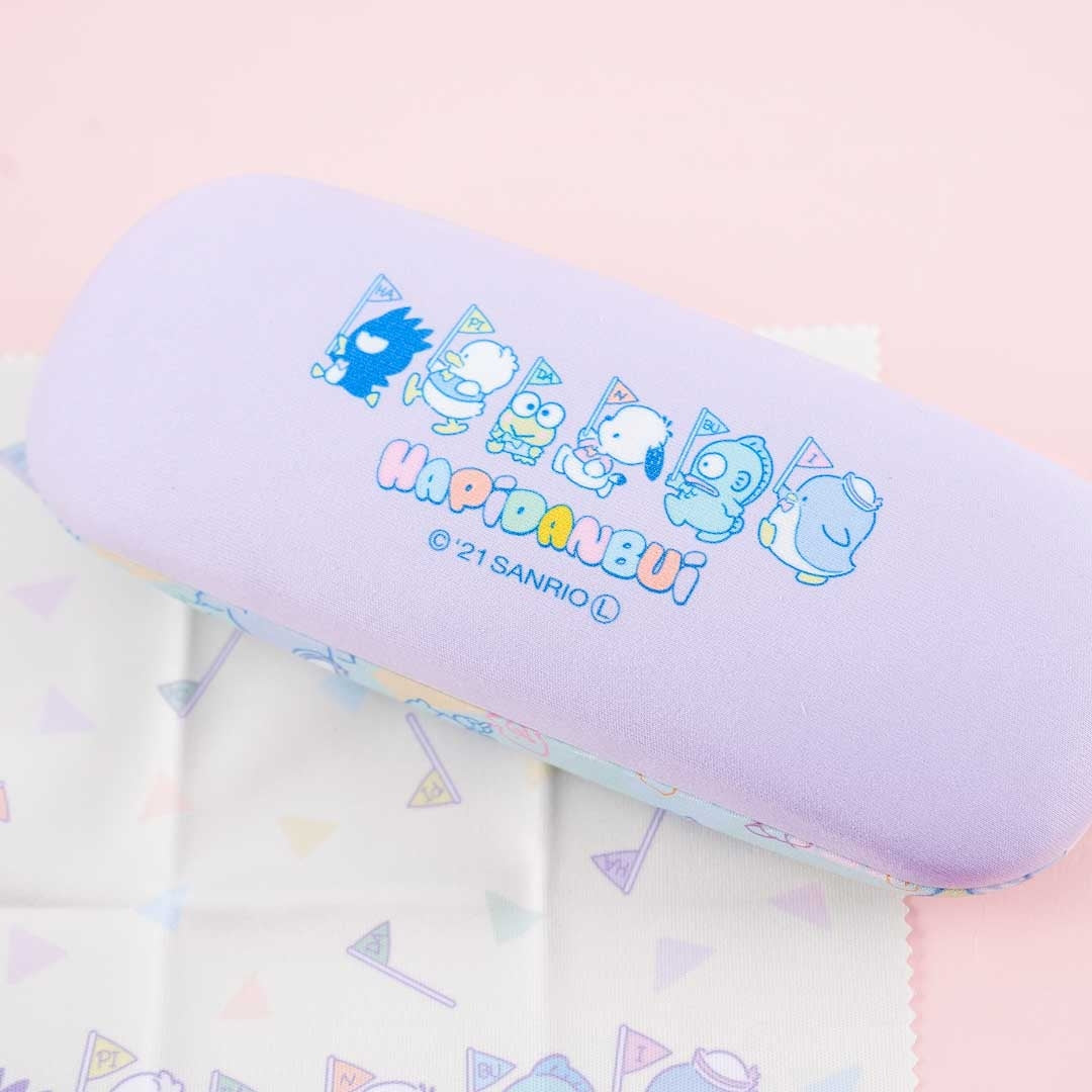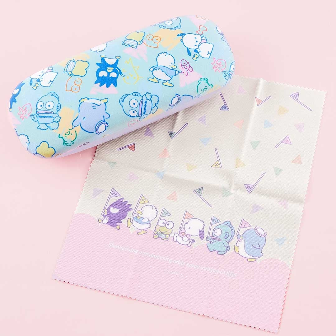 Keep your eyeglasses safe and protected using this hard case. It's covered in prints of the Hapidanbui characters, namely Tuxedosam, Pochacco, Bad Badtz-Maru, Hangyodon, Pekkle, and Keroppi!. There's a microfiber cloth included so you can clean your eyeglasses.