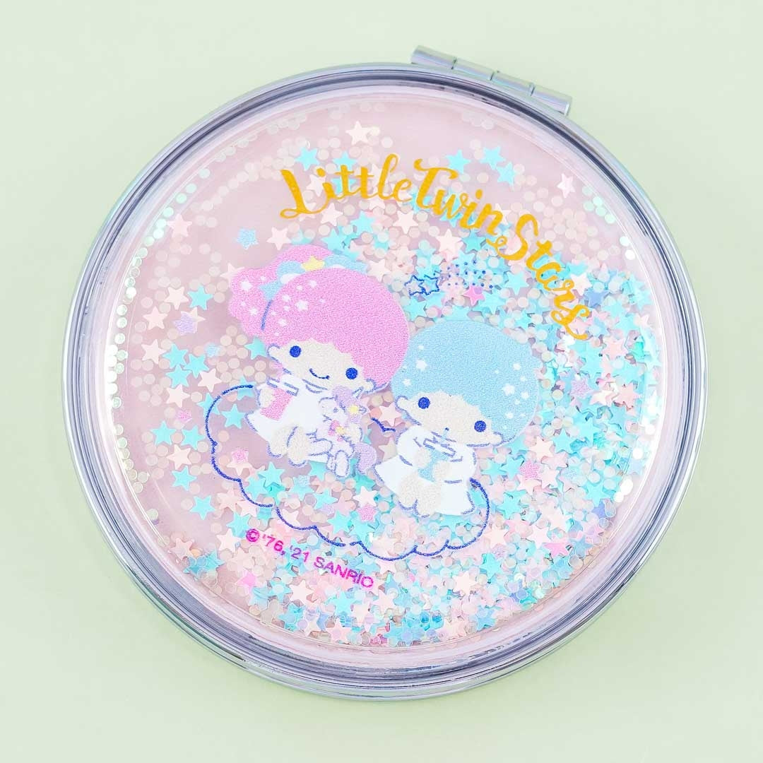 Always have this cute pocket mirror in case of quick touch-ups! This compact has a flat mirror on one side and the other has a magnifying convex mirror used for close-up views. It has prints of the Little Twin Stars and moving glitters shaped like stars and dots outside!
