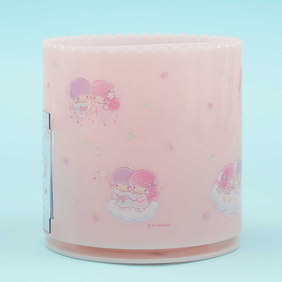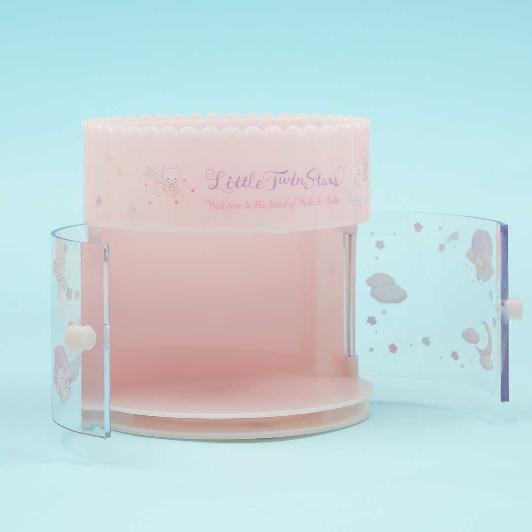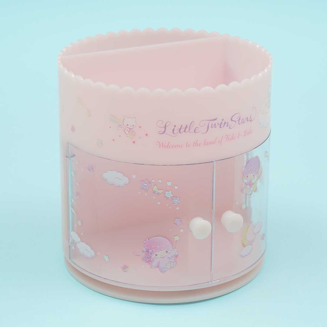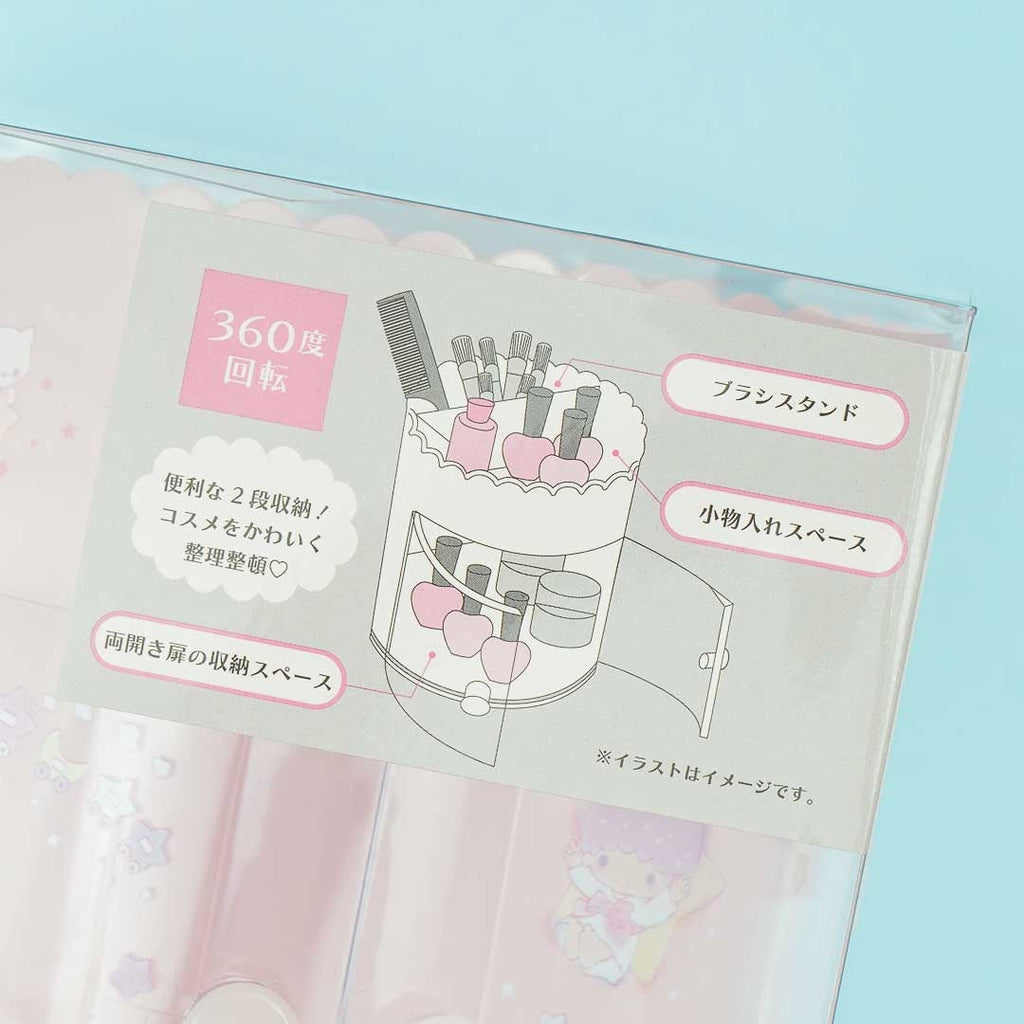 Organize your makeup brushes, nail polish, and other beauty products by placing them in this kawaii cosmetic rack! It has a dedicated stand for brushes, a top rack for smaller items, and spacious storage behind the transparent door. This rack also rotates and is decorated with prints of the Little Twin Stars!