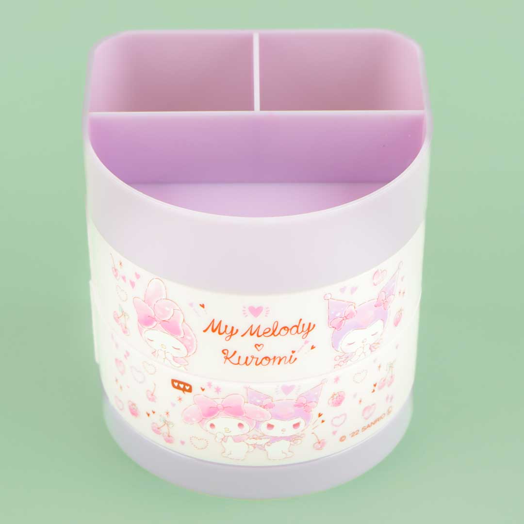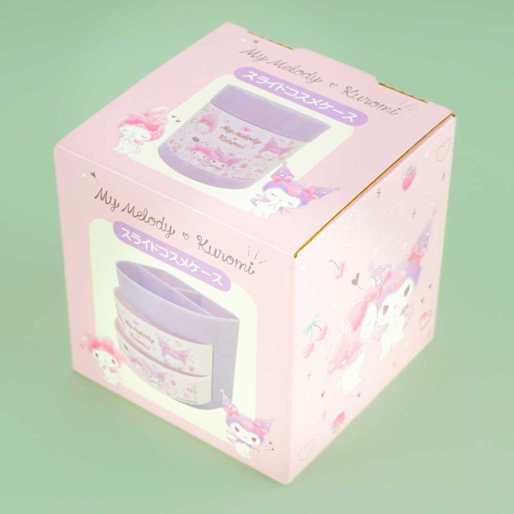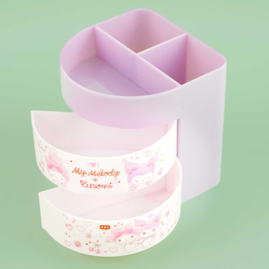 This kawaii organizer is decorated with illustrations of My Melody and Kuromi! It has an upper tray, two separate sections for brushes, and two pull-out drawer trays. Use this unique case to organize your makeup tools!