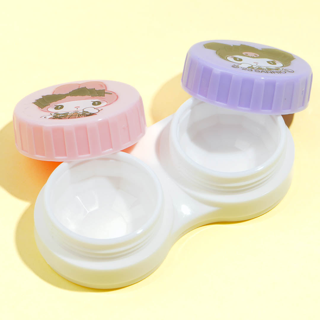Store your prescription or fashion contact lenses inside this super cute case! The left pink lid has a kawaii illustration of My Melody and on the right purple lid is a print of Kuromi — both wearing Gothic Lolita outfits.