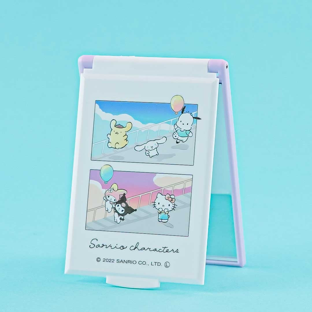 This cute hand mirror features prints of different Sanrio characters with balloons. Use it to touch up your makeup! You can angle this compact mirror so it can stand on your desk.