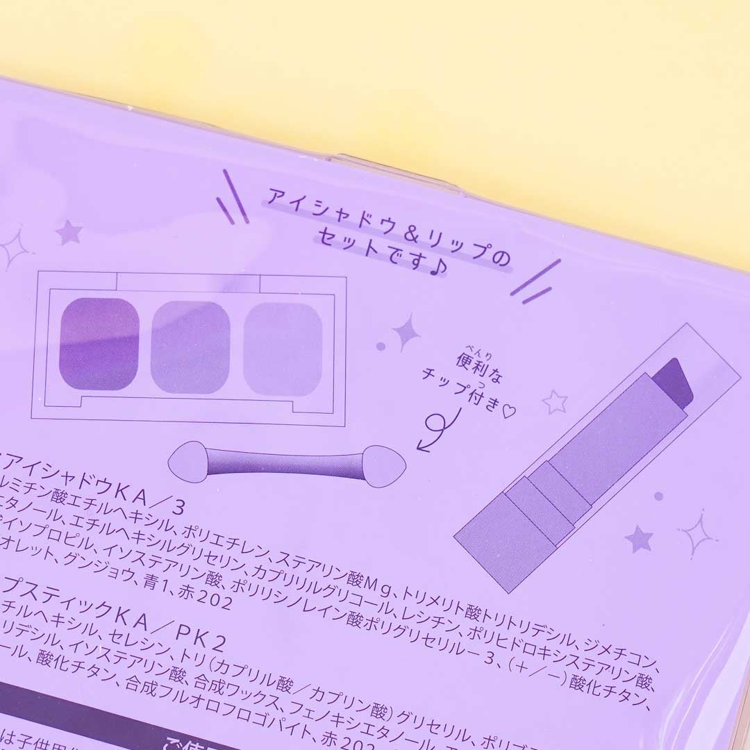 This Kuromi and My Melody-themed makeup set come with an eyeshadow palette with a combination of three shadow colors: blue, purple, and pink! It also includes a tube of pink-red lipstick, a mini eyeshadow applicator, and a transparent carrying pouch. The entire kit is safe to use for almost all skin types and even for children!