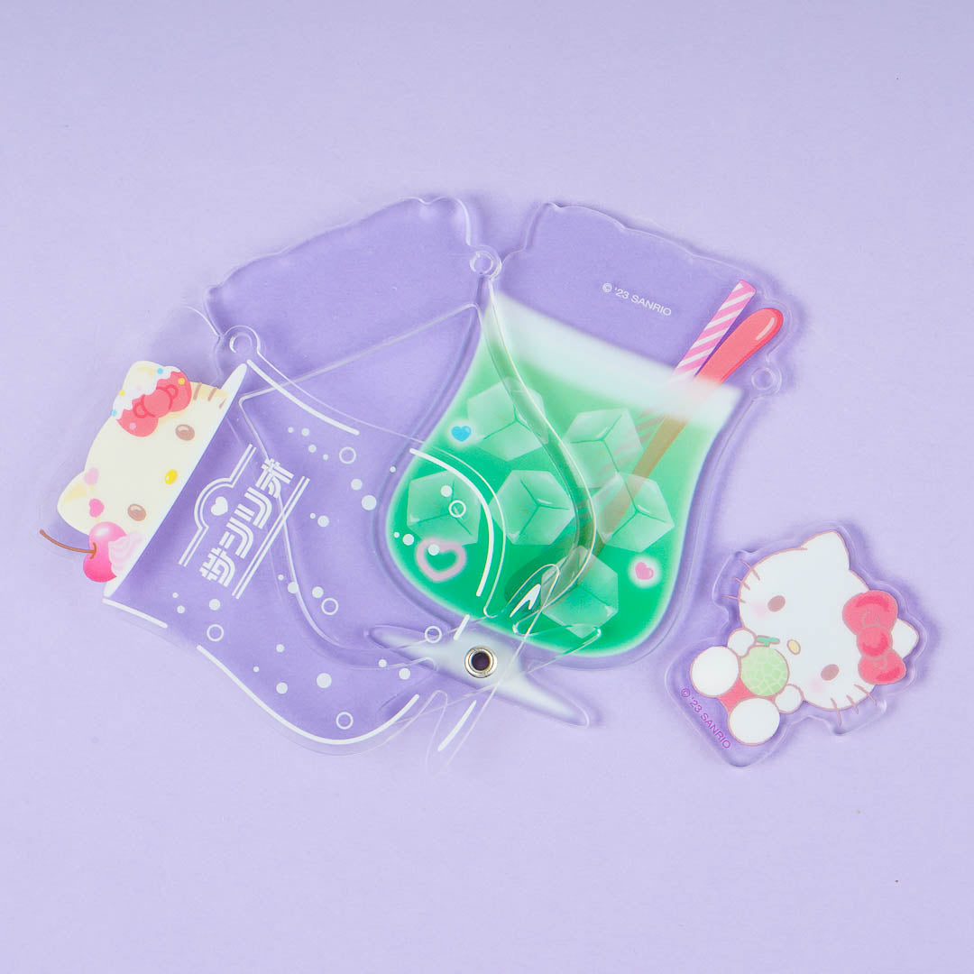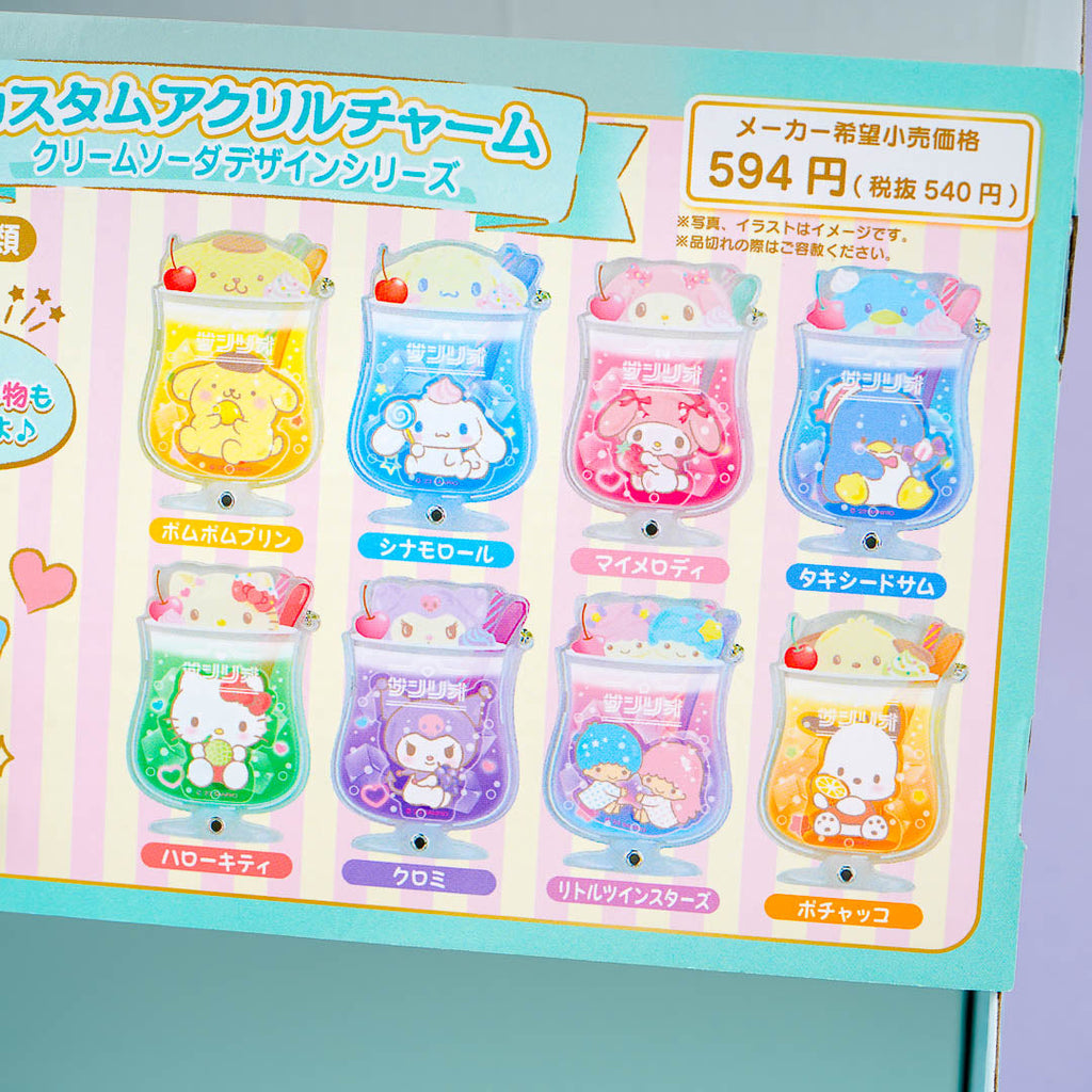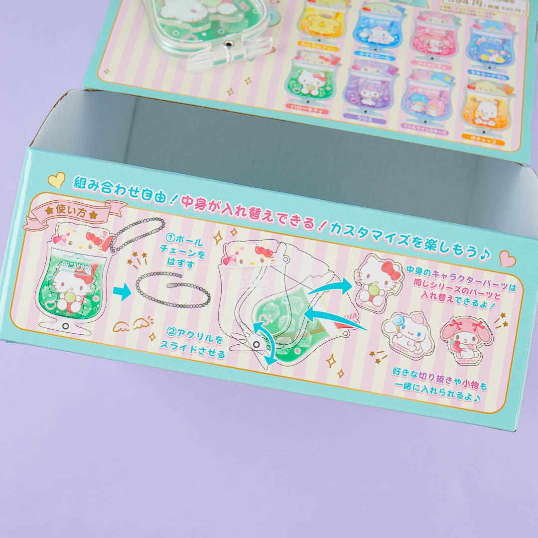 Attach this charm to your bag or house keys so you'll never lose them! It features a Sanrio cutie peeking out from a glass of cream soda. When you remove the ball chain and slide the acrylic cases, you can customize it by taking out its parts and adding stickers or cutouts.