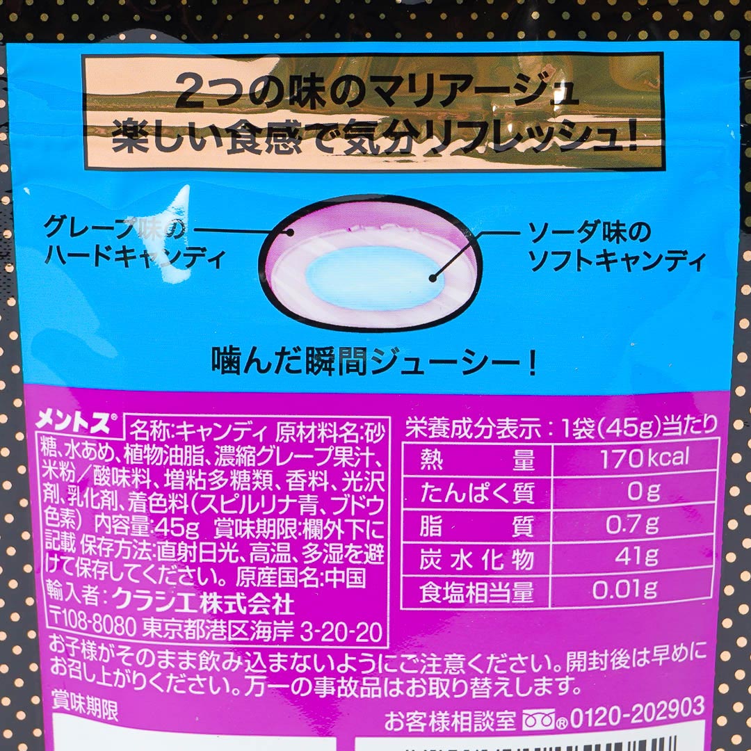 A resealable pack of candy with a grape-flavored sugar shell and a soft soda-flavored inner part