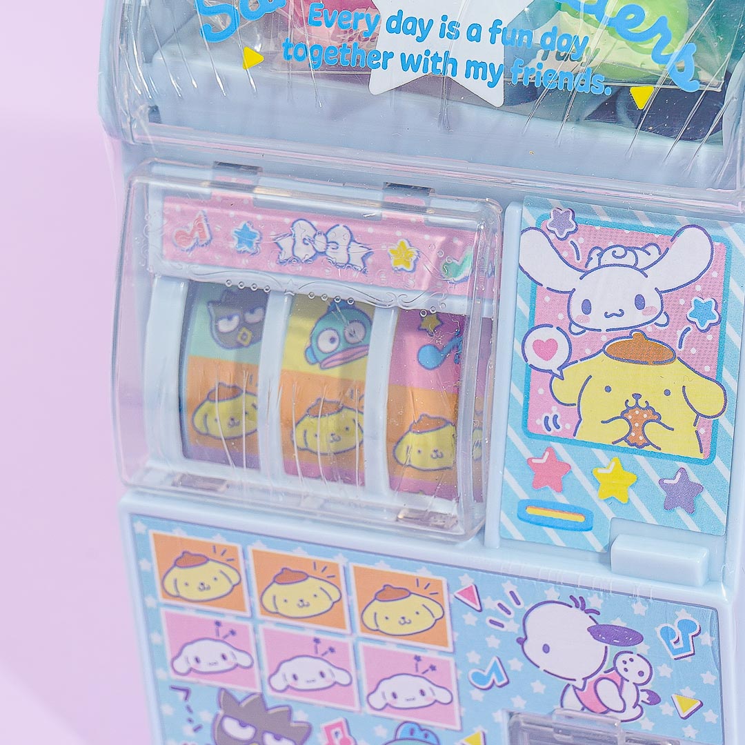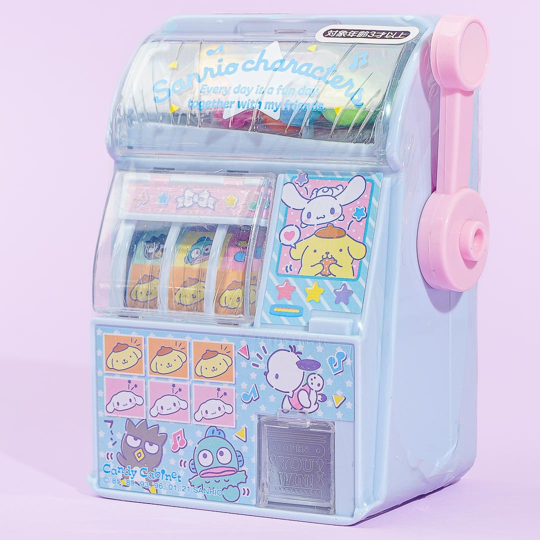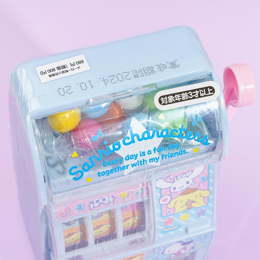 Have fun playing with this cute slot toy! It's illustrated with Sanrio characters like Pochacco, Cinnamoroll, Pompompurin, and more. This slot machine toy also has balls of chewing gum inside it.