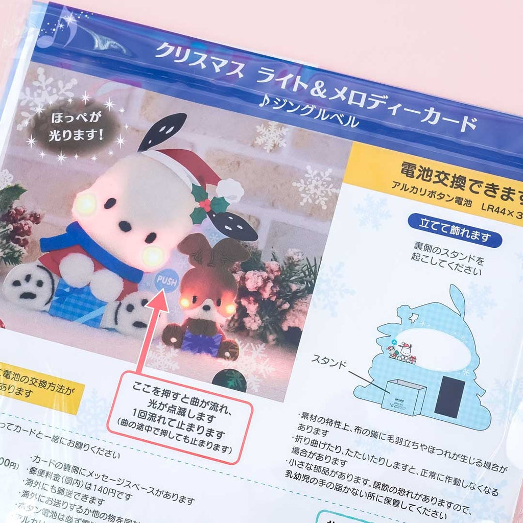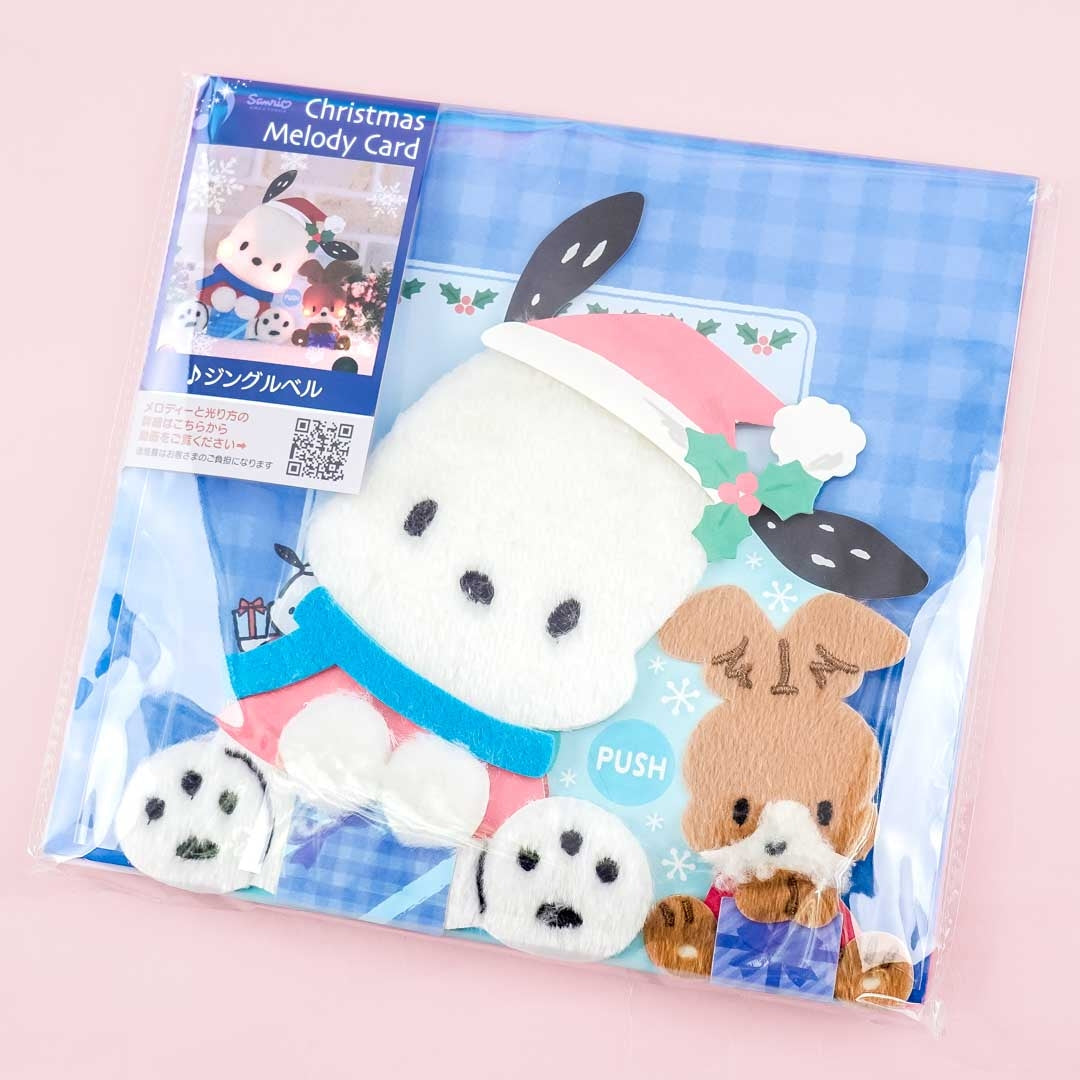 Send warm wishes to loved ones using this kawaii fluffy Christmas card. It's illustrated with Pochacco dressed up for the holiday season! This card lights up and plays the song "Jingle Bells." You'll receive an envelope together with the card.