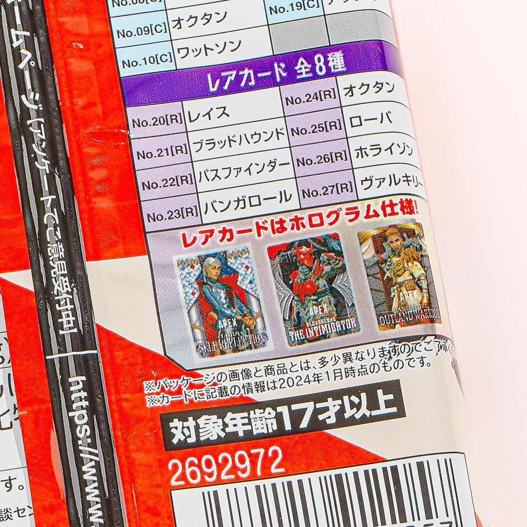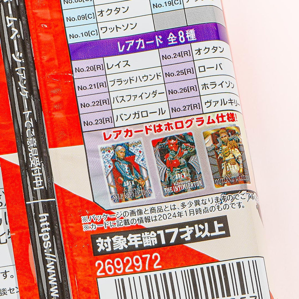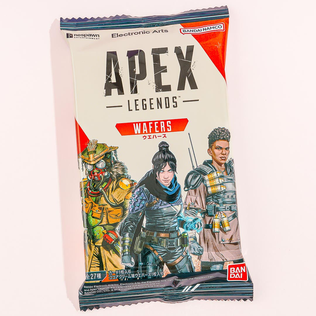 Enjoy munching on this delicious cocoa-flavored wafer! It comes with a collectible card showcasing the heroes from the popular video game, "Apex Legends." You'll get a randomly selected packaging featuring cool illustrations from the game!