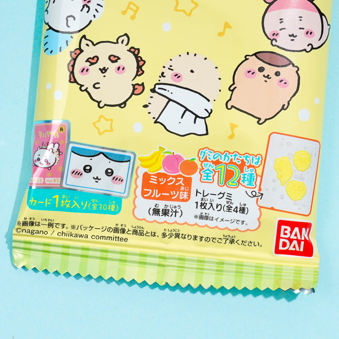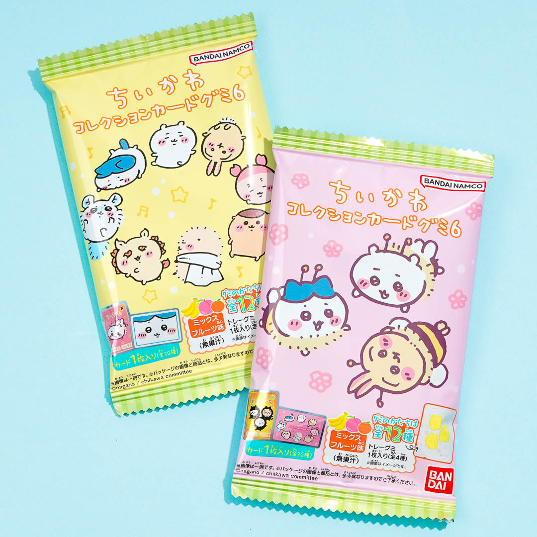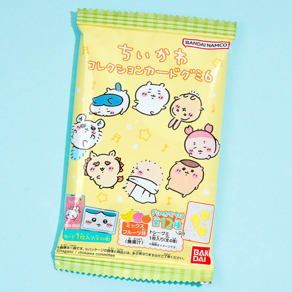 Have fun collecting Chiikawa cards while munching on mixed fruit-flavored gummies! This pack comes from the sixth series of the "Chiikawa Collection Card Gummi" collection. Surprise yourself with a character card, or a rare gold card if you're lucky!