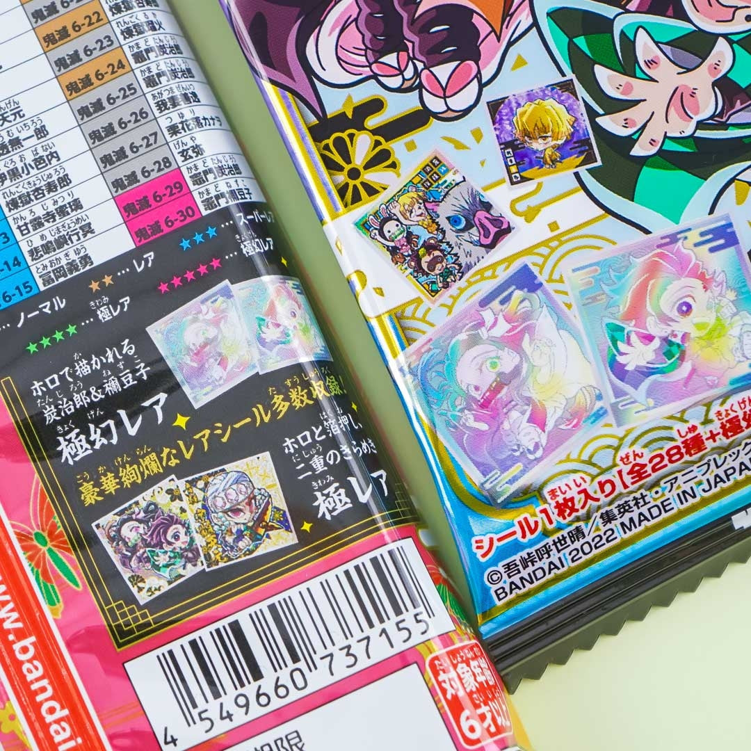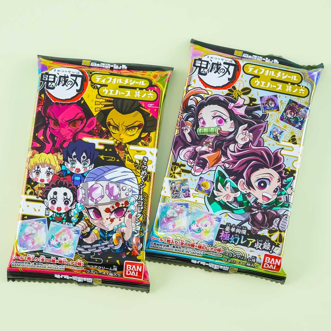 This pack of cocoa cream wafer features prints of Demon Slayer characters! It comes with a sticker randomly selected from a set of 28 regular designs and 2 special holographic designs. Surprise yourself with a random package design when you order!