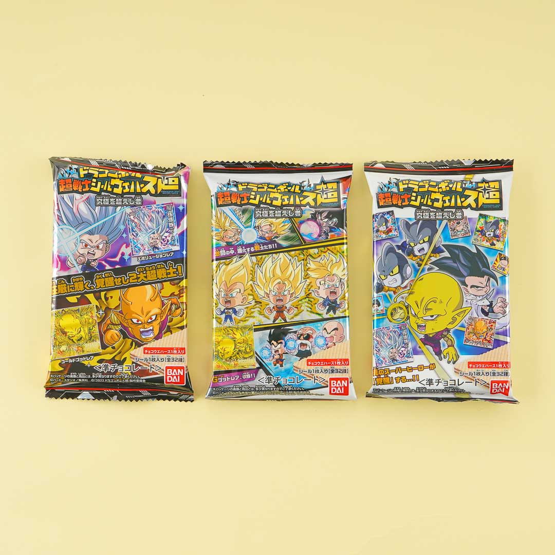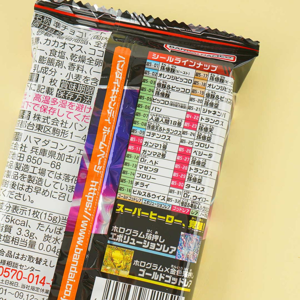 Have fun snacking on this chocolate wafer pack illustrated with cute Dragon Ball characters. It comes with a Dragon Ball Super Warrior Seal Vol. 5 series sticker. You'll get a random Dragon Ball sticker design that includes characters from the new movie "Dragon Ball Super: Super Heroes."