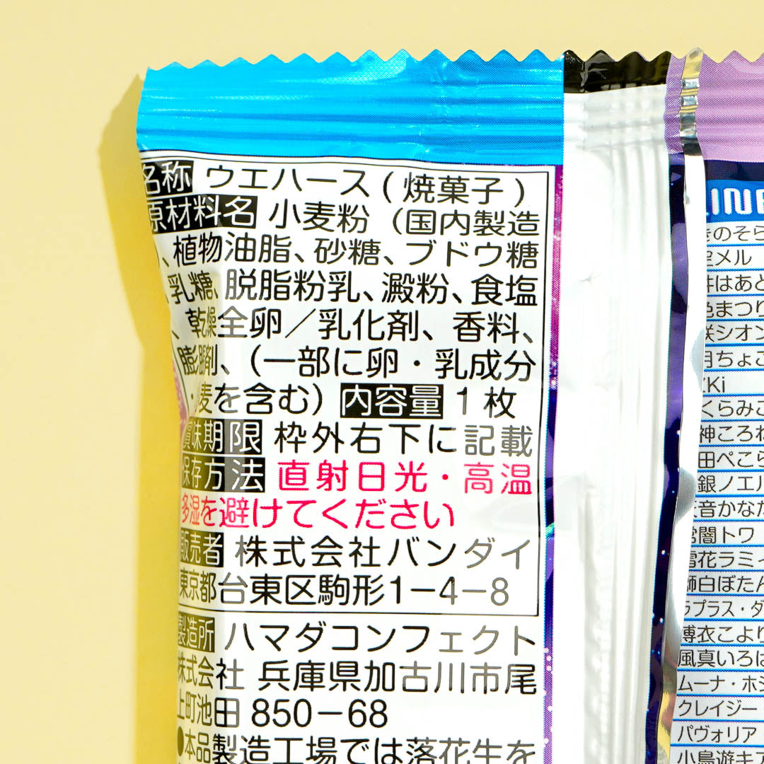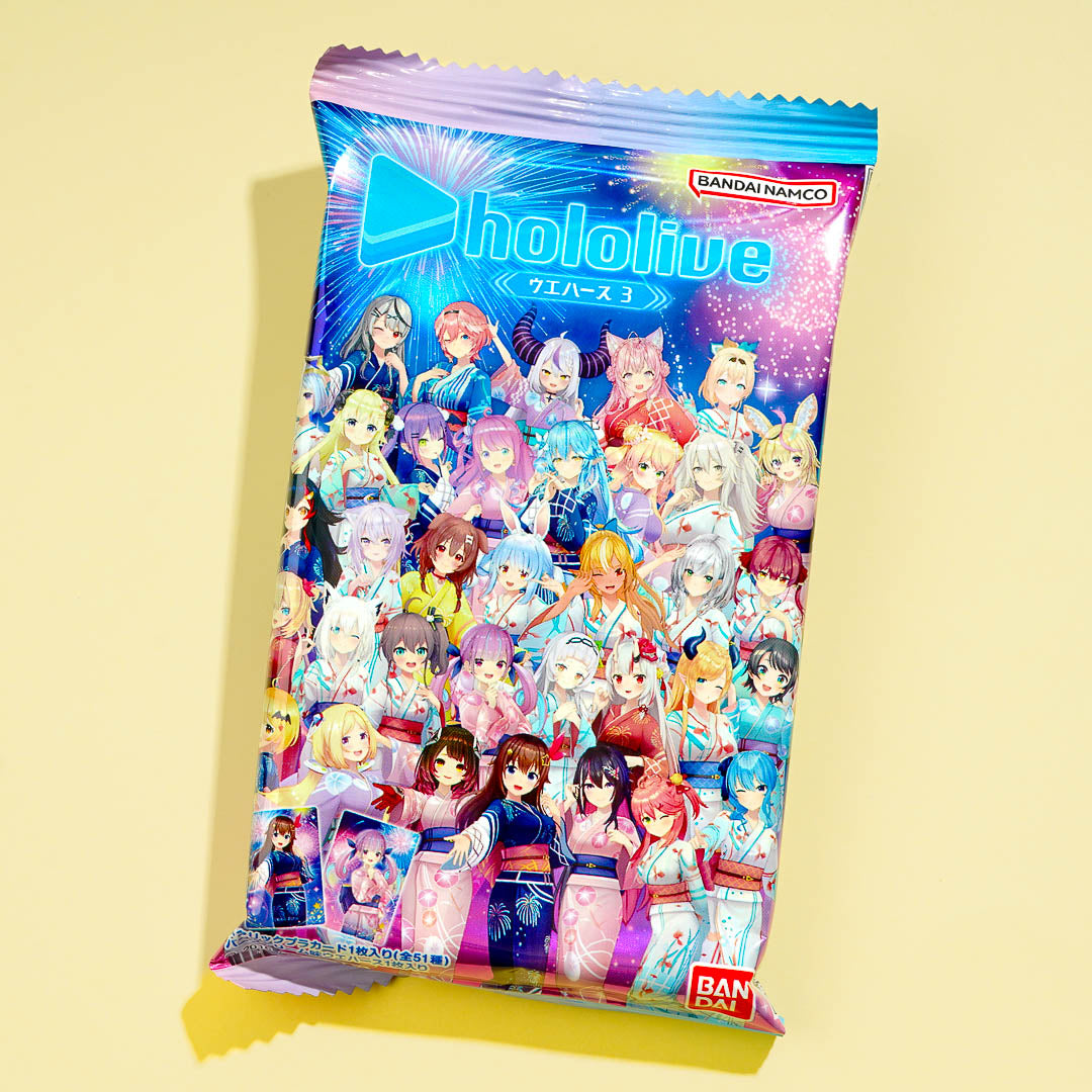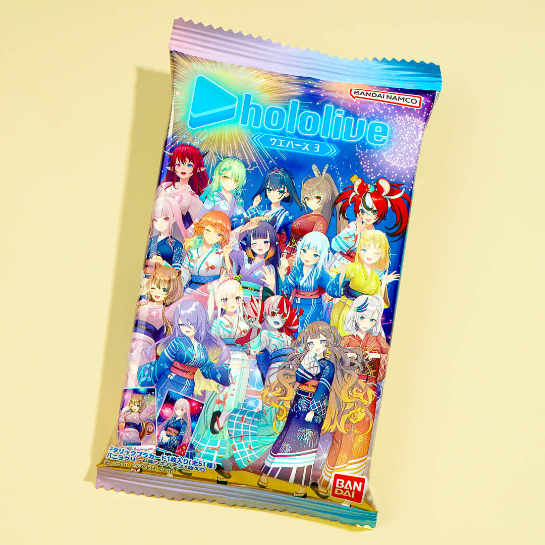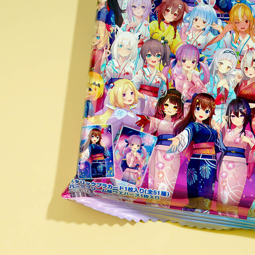 Snack on this delicious vanilla cream wafer pack featuring V-tubers from Hololive! This tasty treat comes with a collectible Hololive V-tuber card that you can add to your otaku haul. Surprise yourself with a random card from a set of 51 designs when you order.