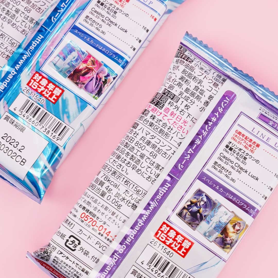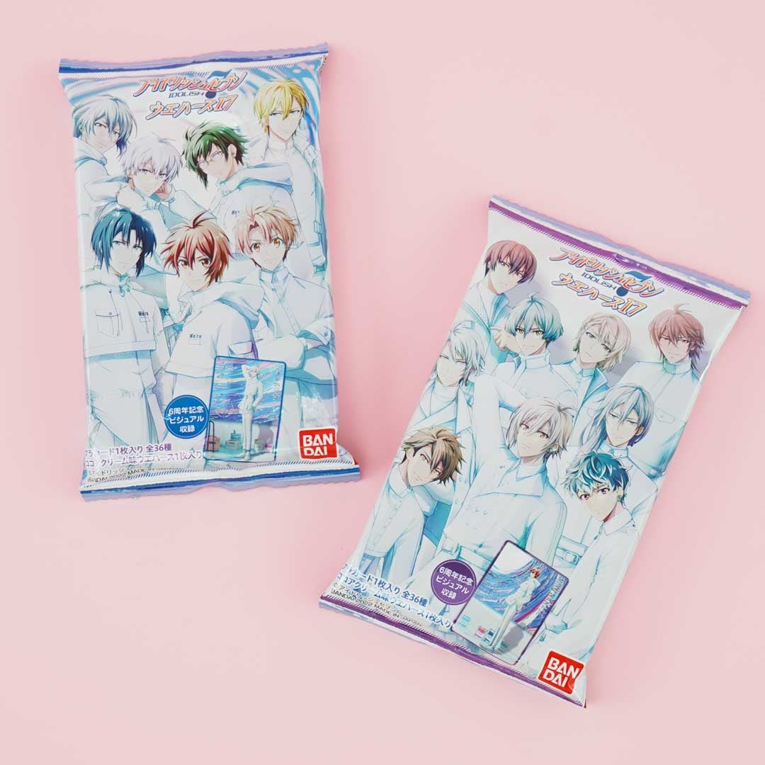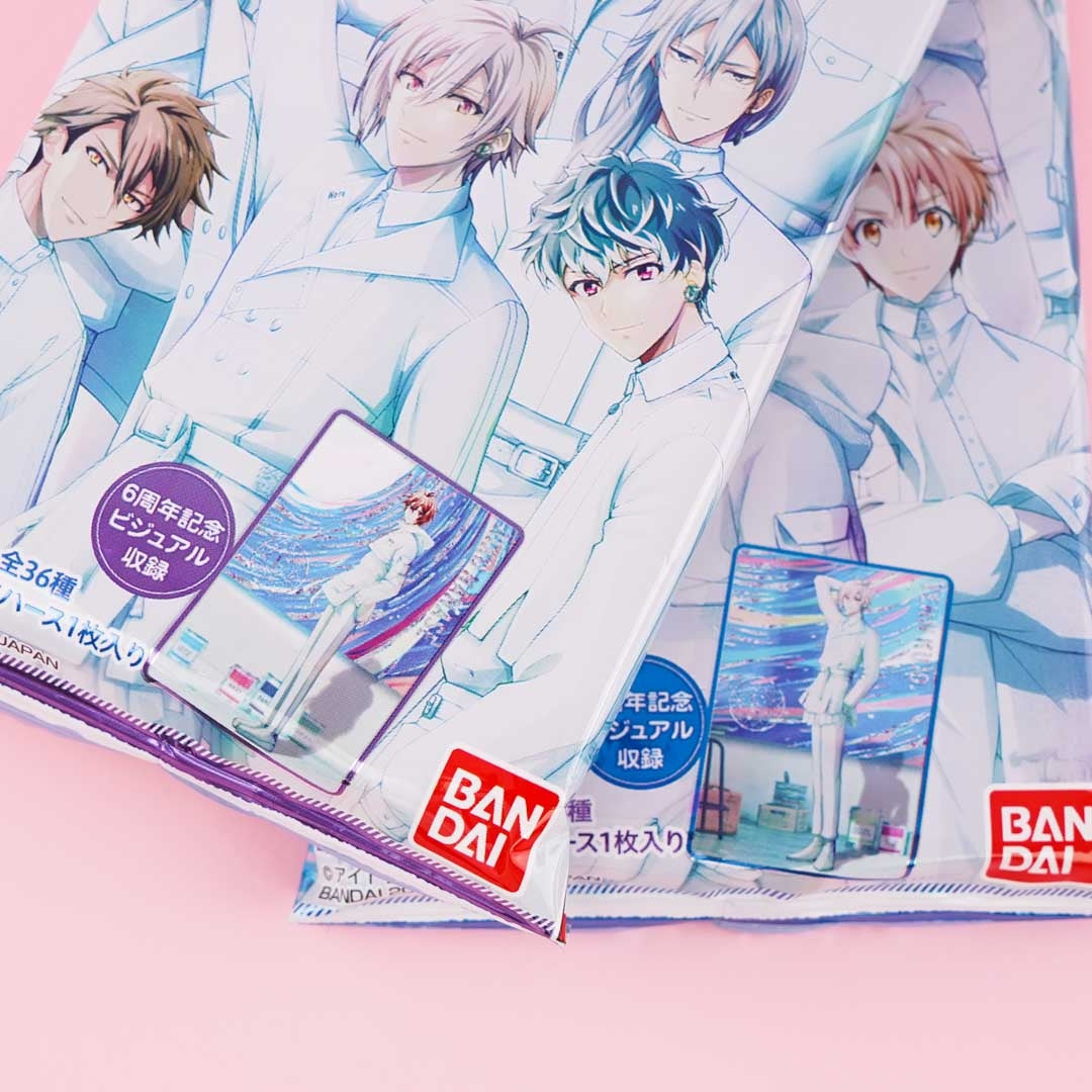 Enjoy collecting all the cards from the seventeenth volume release for the popular Japanese rhythm mobile game called “Idolish7” which is about managing a new male idol group! The set comes with one double-sided card featuring a random character wearing their sixth-anniversary costume and a free cocoa cream-flavored wafer. You’ll receive a random character card with a metallic hologram finish out of thirty-six possible designs!