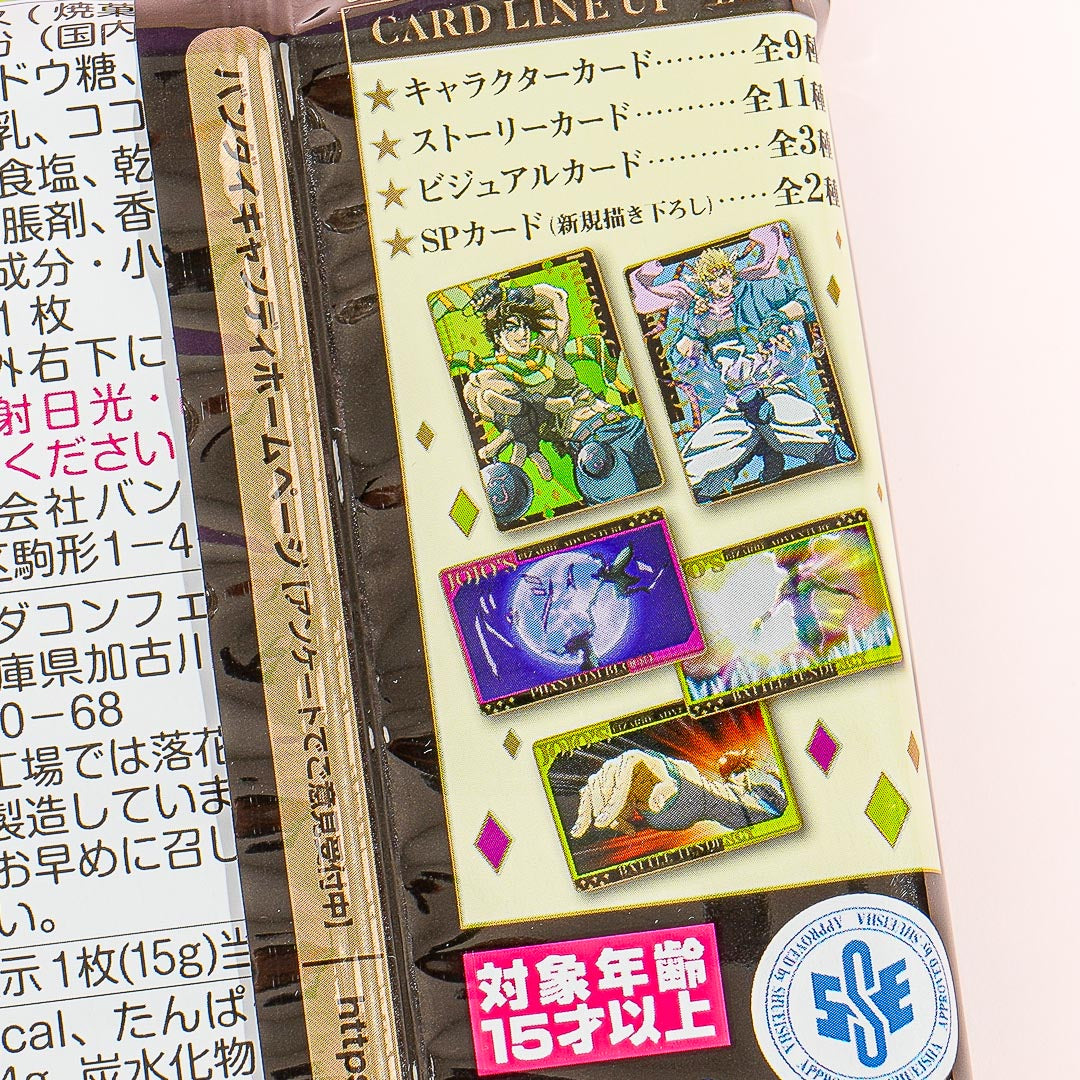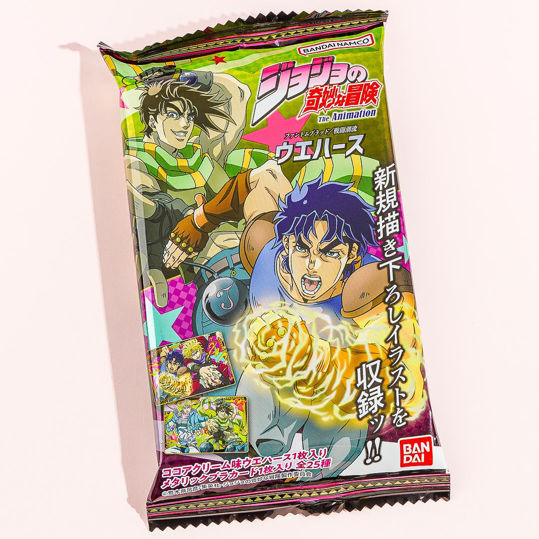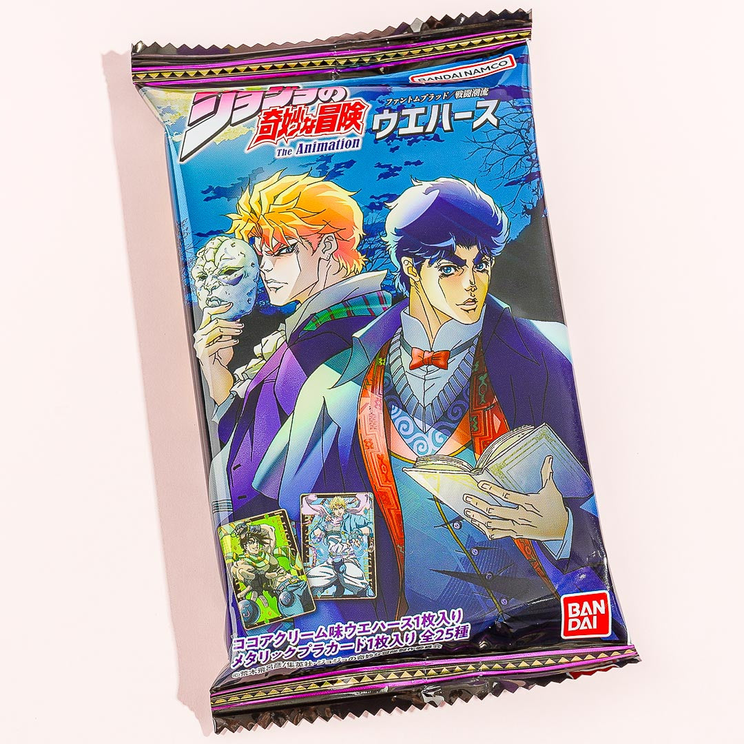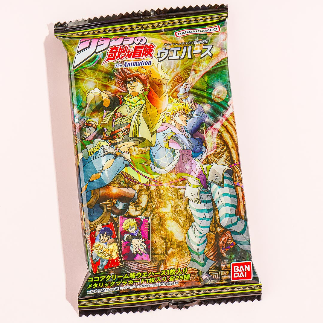 Indulge in this crispy wafer snack with a delicious cocoa cream flavor! The chocolatey treat also comes with a free collectible character card from the two story arcs “Phantom Blood” and “Battle Tendency” from the popular anime series, “JoJo’s Bizarre Adventures.” By ordering, you’ll get a random metallic card.