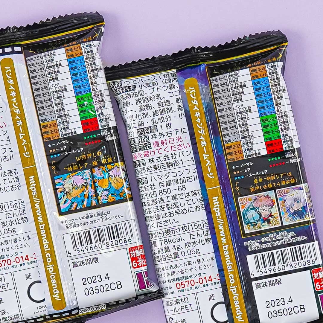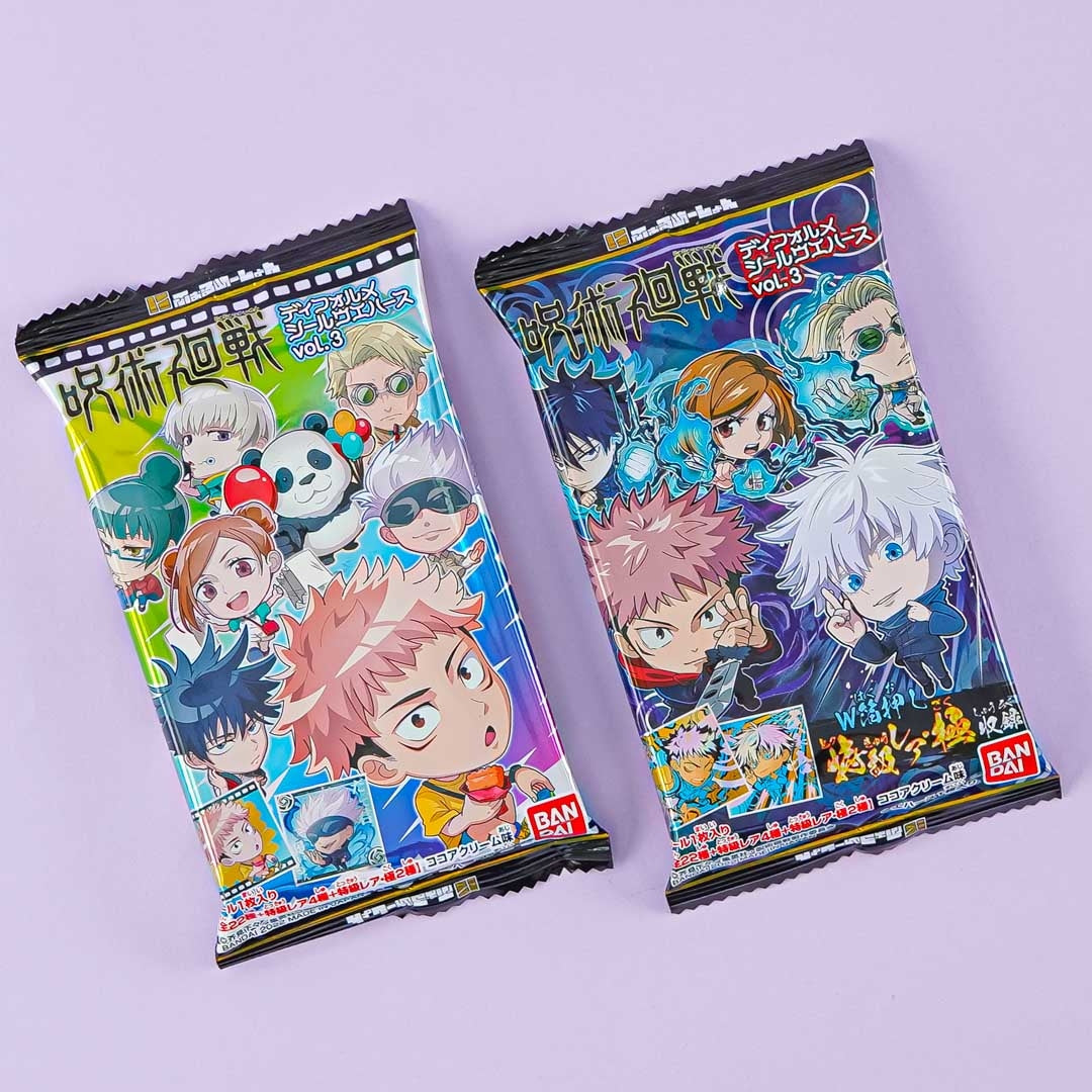 Snack on this yummy cocoa cream-flavored wafer pack illustrated with the deformed or chibi version of Jujutsu Kaisen characters! It comes with a fun Jujutsu Kaisen card randomly taken from a set of 28 designs.