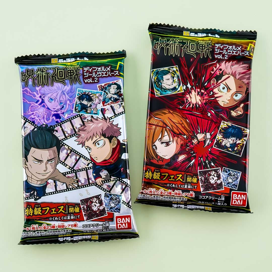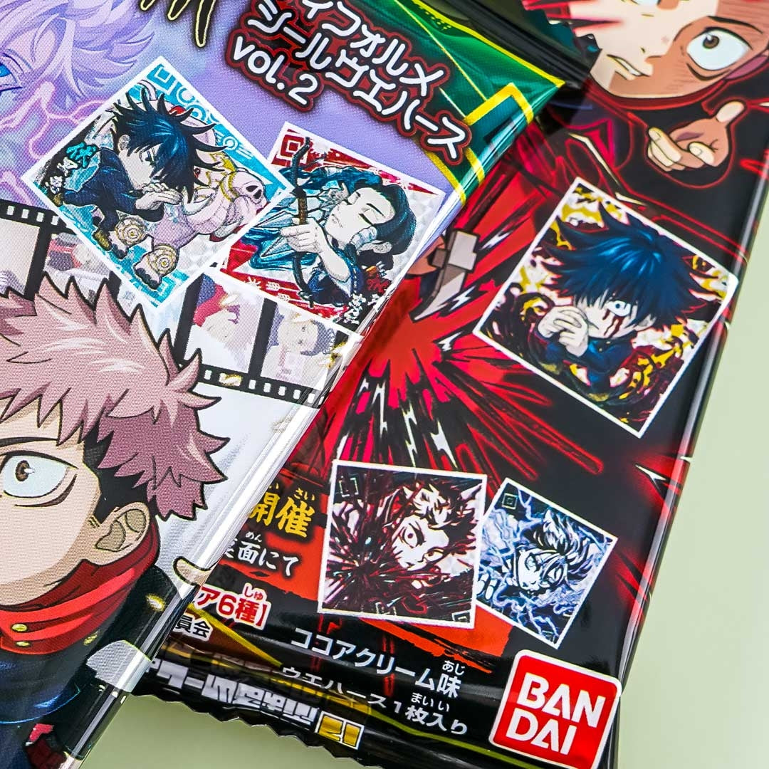 Enjoy snacking on this pack of cocoa cream-flavored wafer illustrated with Jujutsu Kaisen characters! It comes with a sticker randomly selected from a set of 23 regular and 6 rare designs. Surprise yourself with a random package design when you order.
