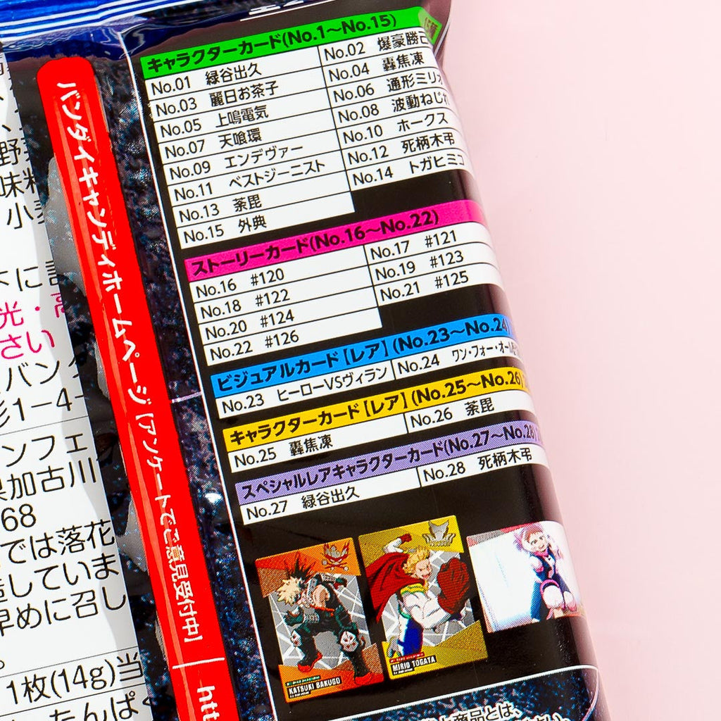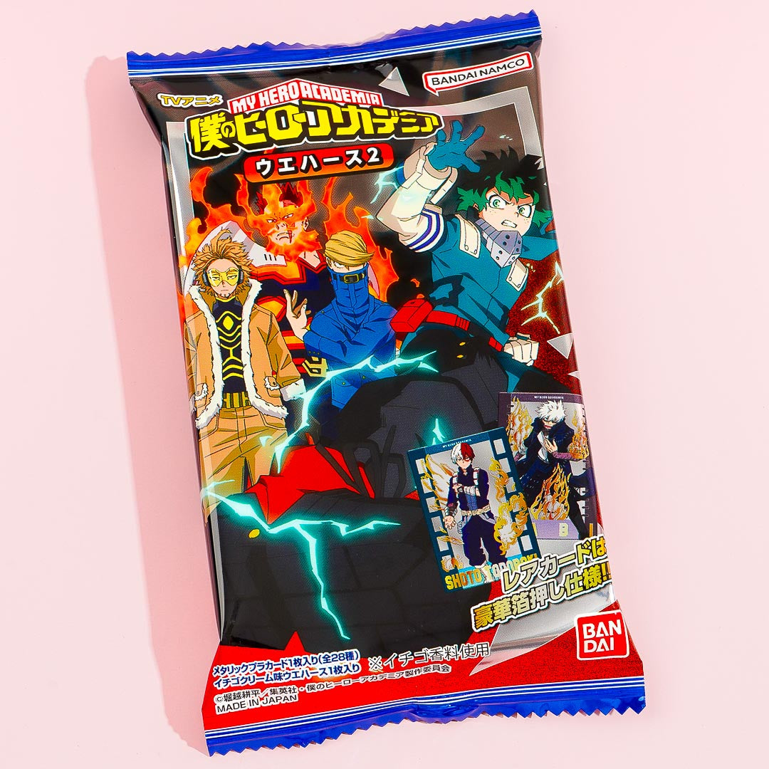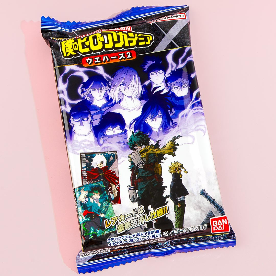 Snack on this strawberry cream wafer pack while watching the next episode of your favorite anime. It showcases prints of characters from My Hero Academia! This wafer pack also comes with a My Hero Academia collectible card. Surprise yourself with a random card design when you order.