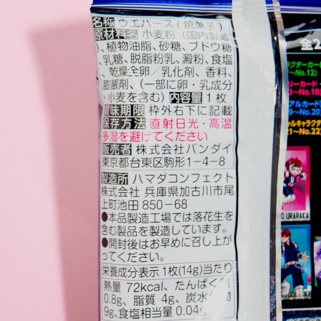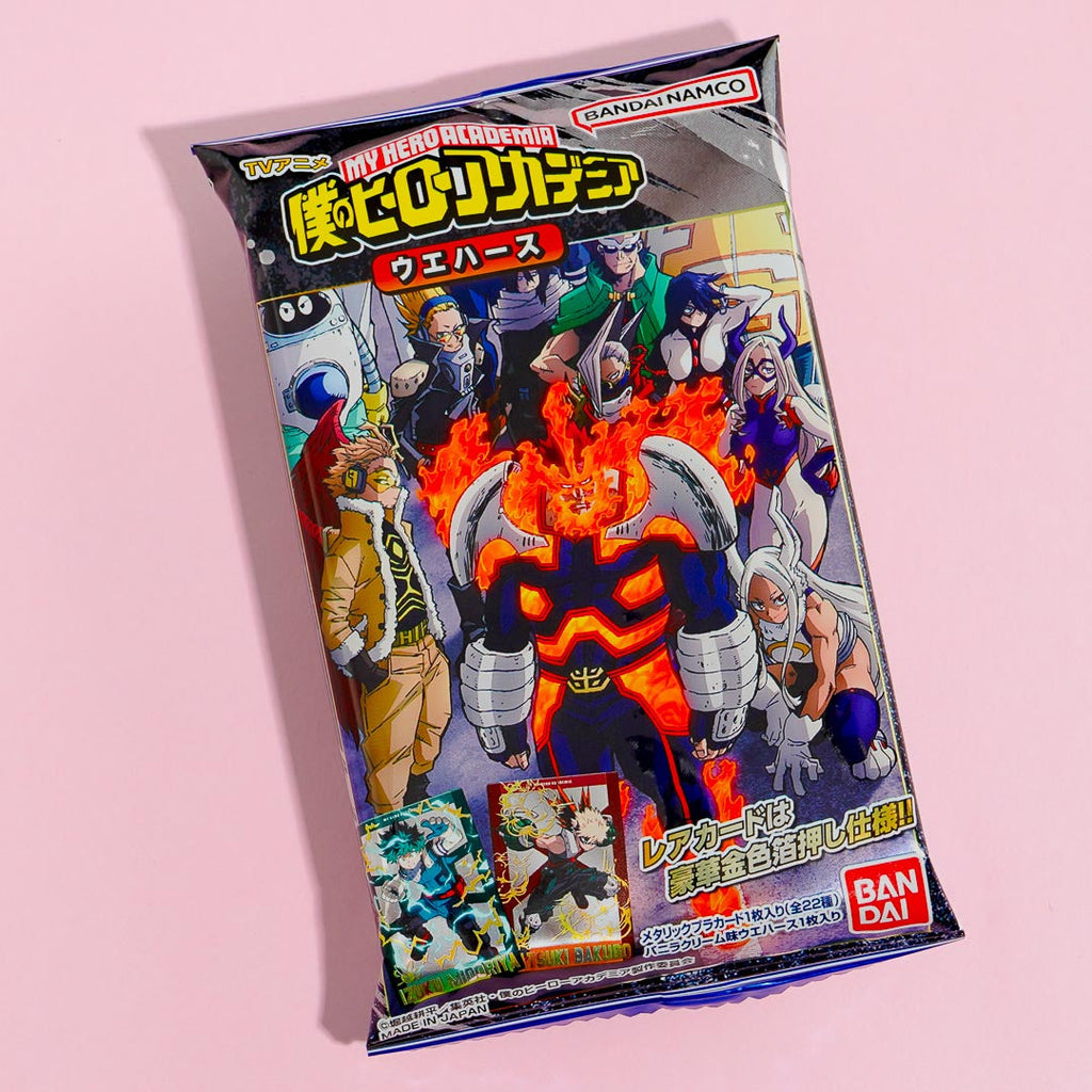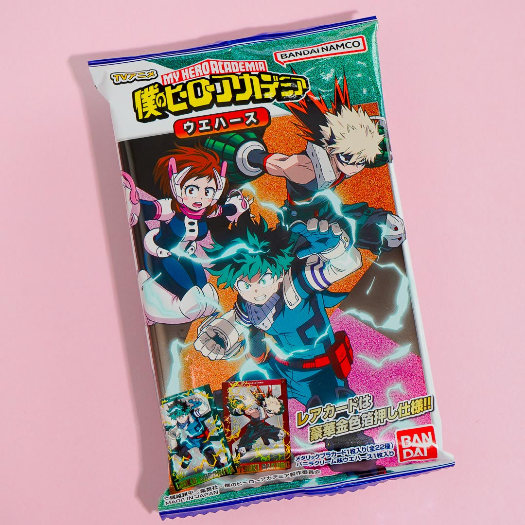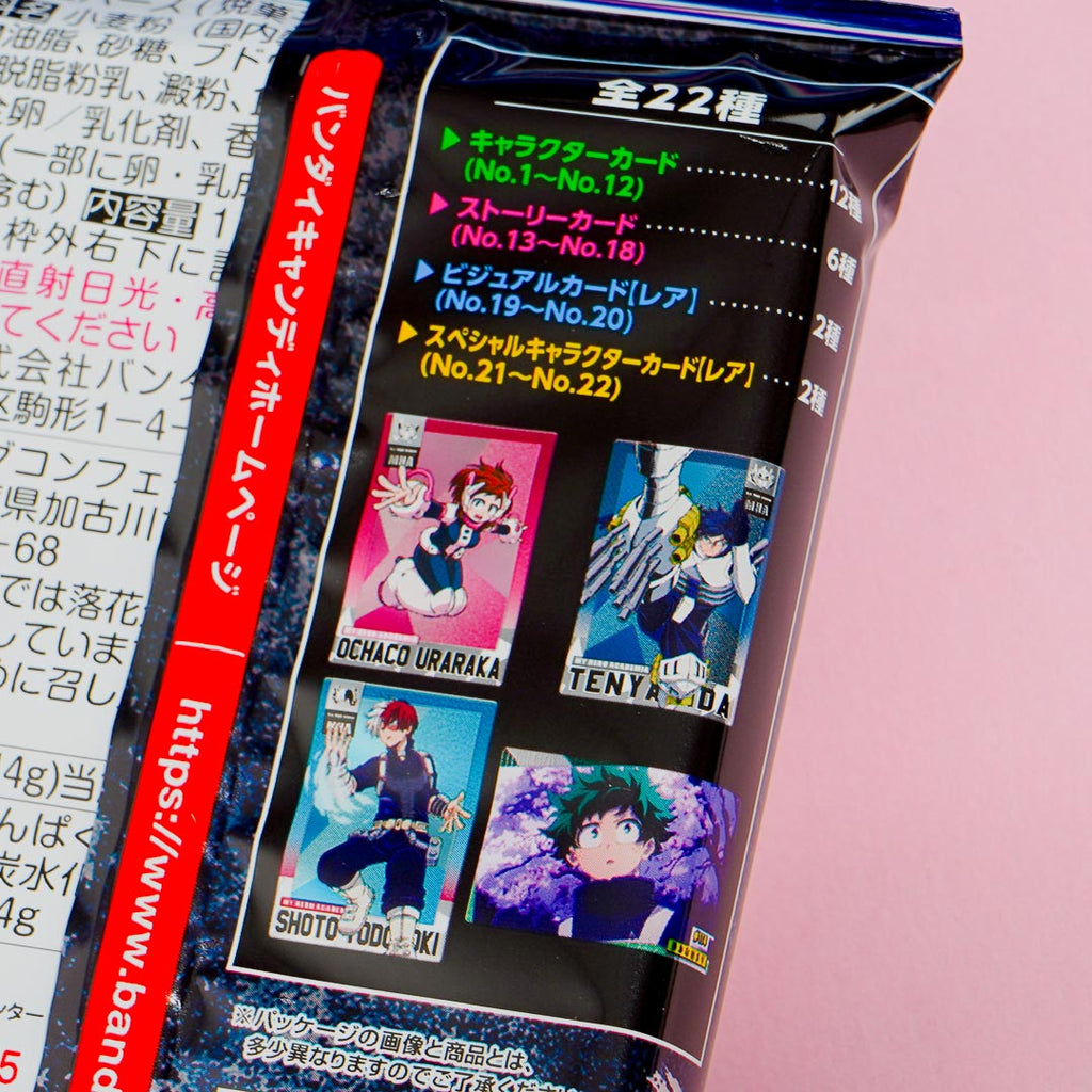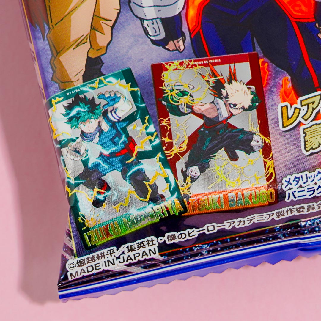 Expand your My Hero Academia collection with this set! It comes with a metallic placard and a free vanilla-cream-flavored wafer. The card features a My Hero Academia character and if you're lucky, you can get one of the four special cards with gold foil stamping!