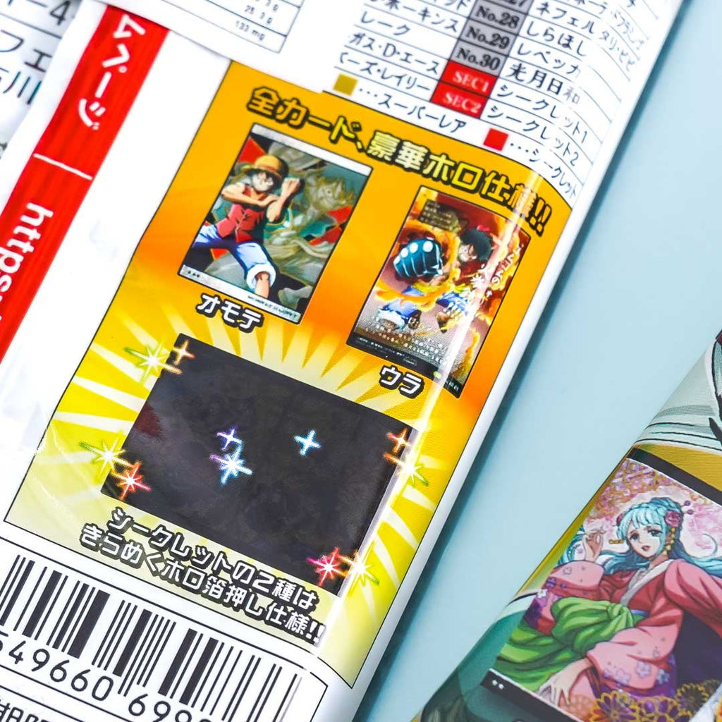 Add this One Piece card to your collection of anime merchandise! It comes with a cocoa cream wafer that you can snack on. This card was randomly selected from a set of 30 regular designs and 2 secret designs featuring One Piece characters. You'll receive one random package design when you order.