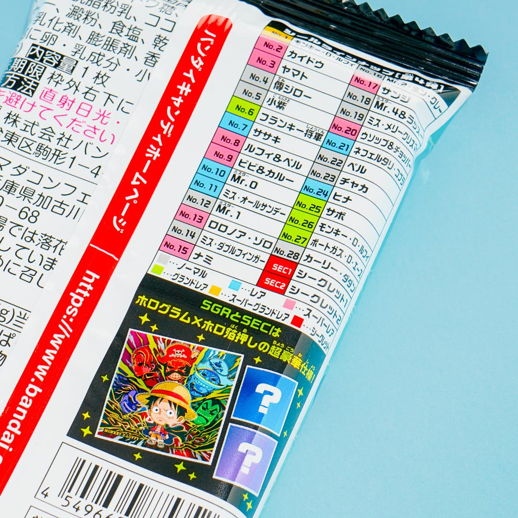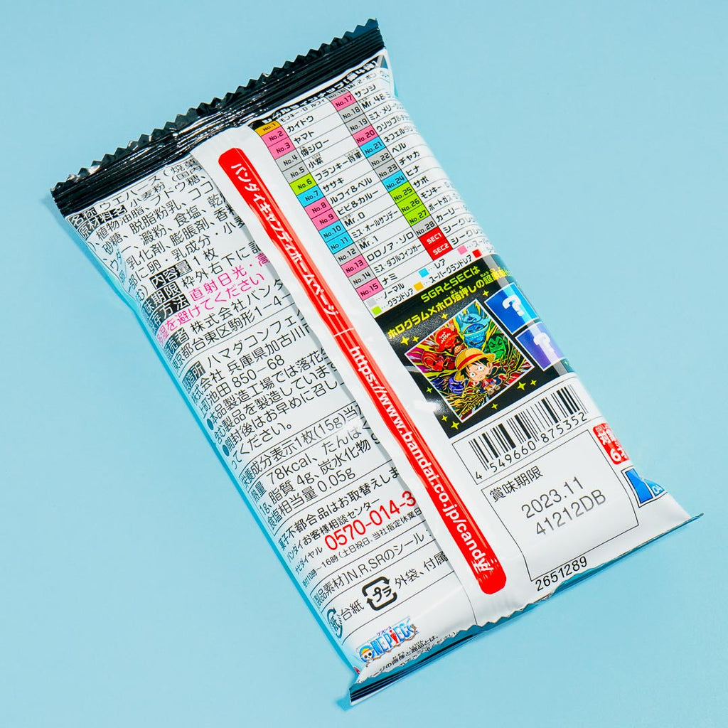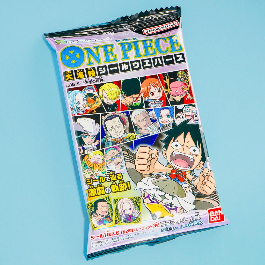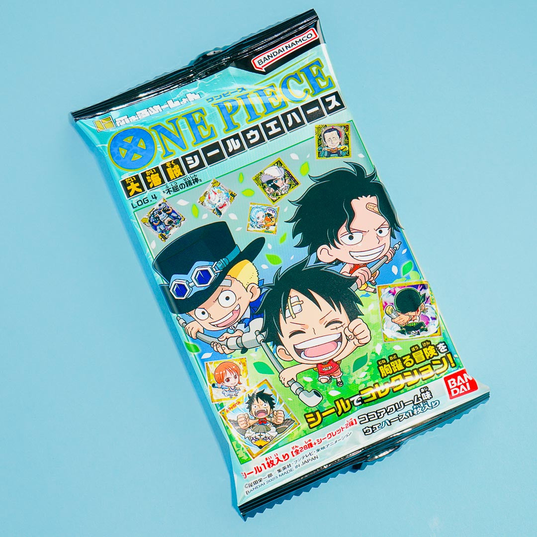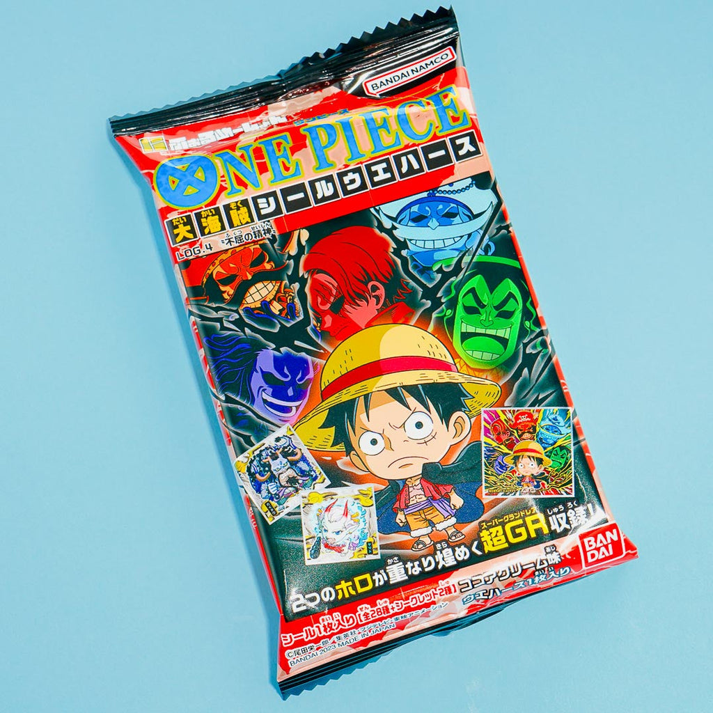 Have fun munching on this yummy wafer pack illustrated with One Piece characters. It comes with a free sticker from the One Piece Large Pirate Seal Sticker collection which showcases One Piece designs with glitter, metallic, and holograms. Get one random sticker design from a set of 30 sticker designs.