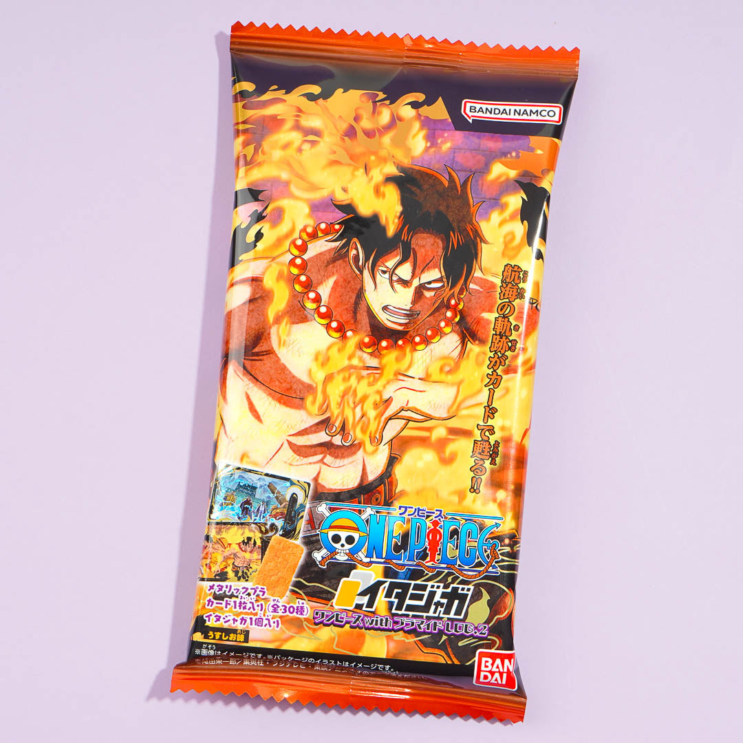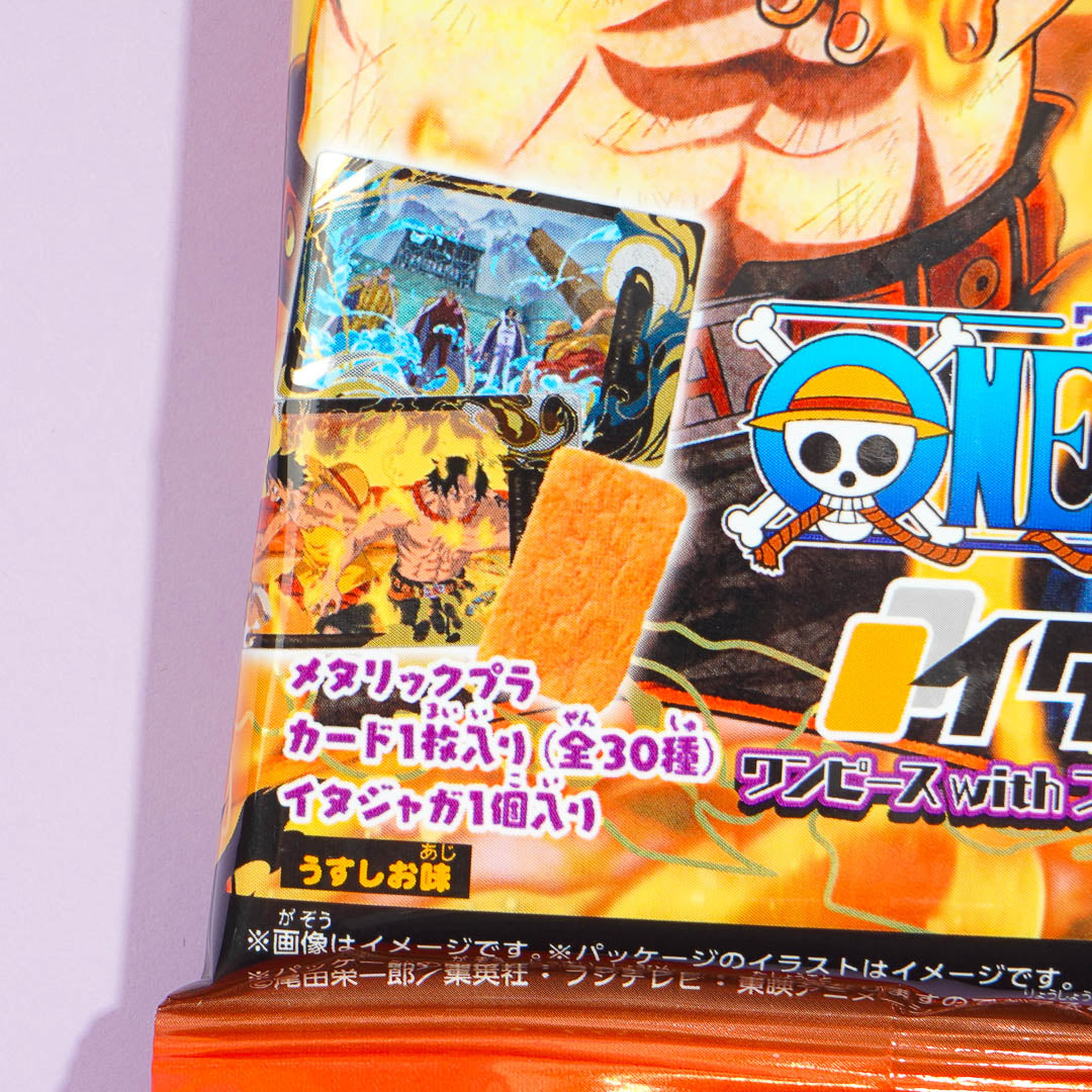 Enjoy these “itajaga” or crunchy and savory snacks that are made with corn grits while watching your favorite anime! The pack also includes a special One Piece character card with a metallic finish. By ordering, you’ll get a random card design.
