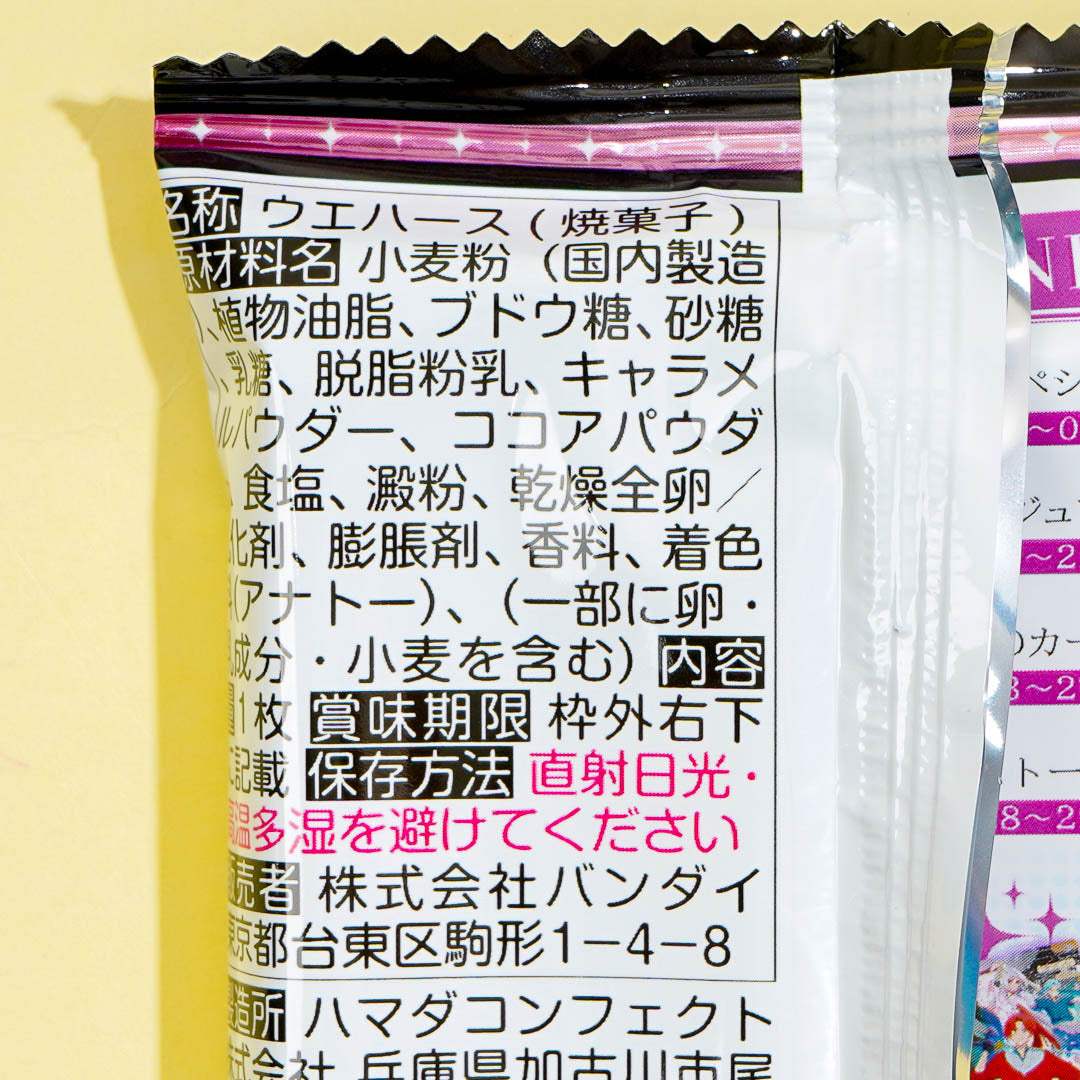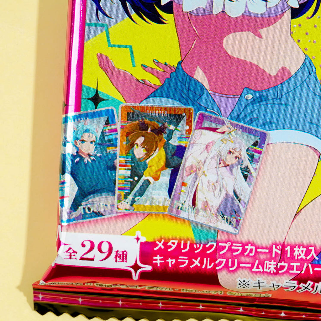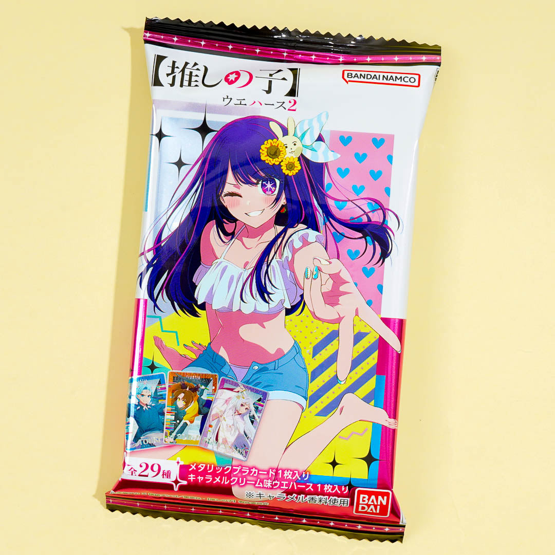 Snack on a yummy chocolate-flavored wafer and get a surprise collectible card! The holographic card has a back-to-back design featuring the anime series Oshi No Ko.