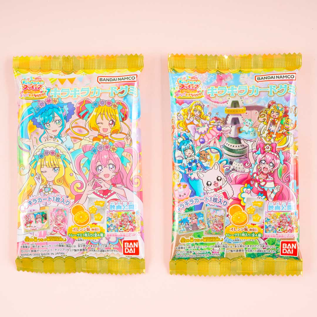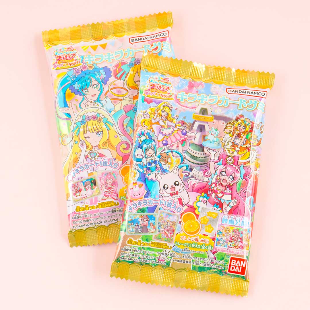 Snack on this yummy pack of orange-flavored gummy candy illustrated with Pretty Cure characters! It comes with a collectible card.