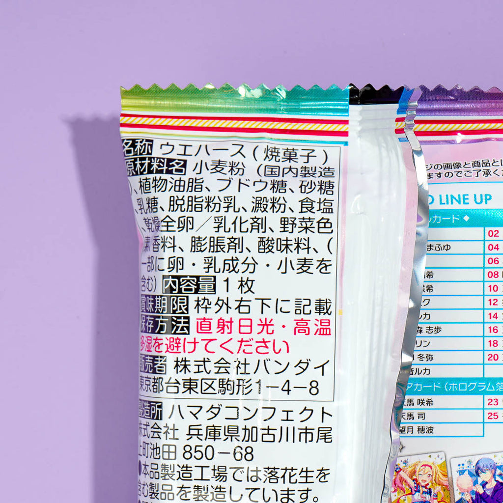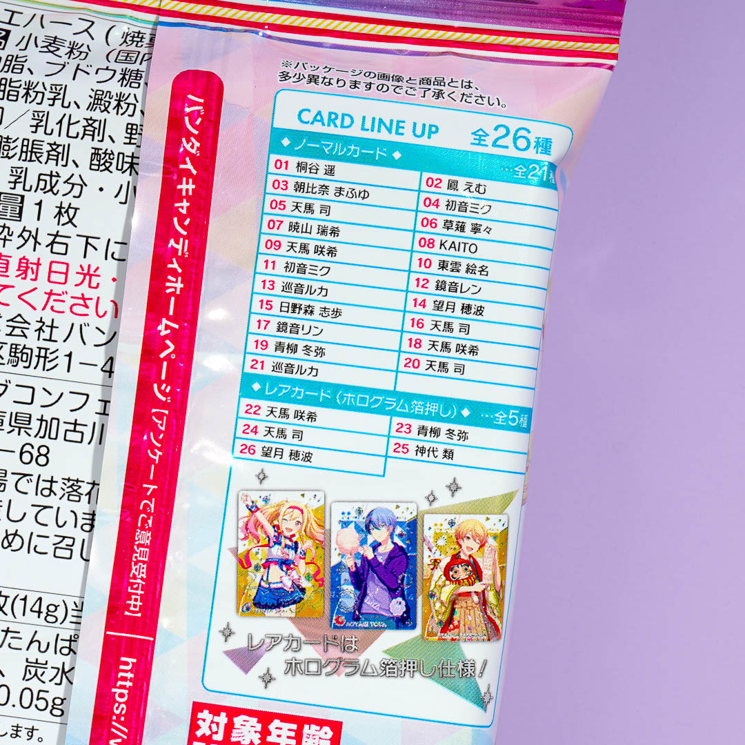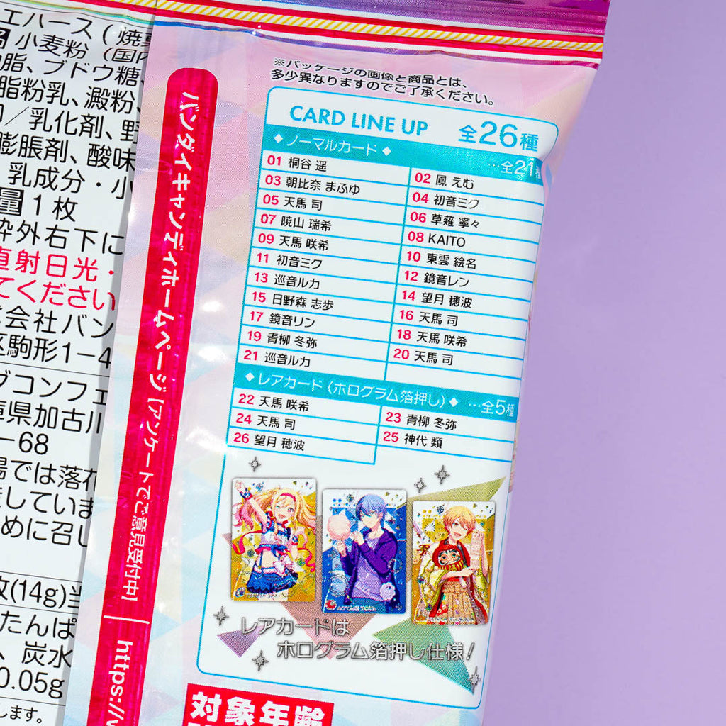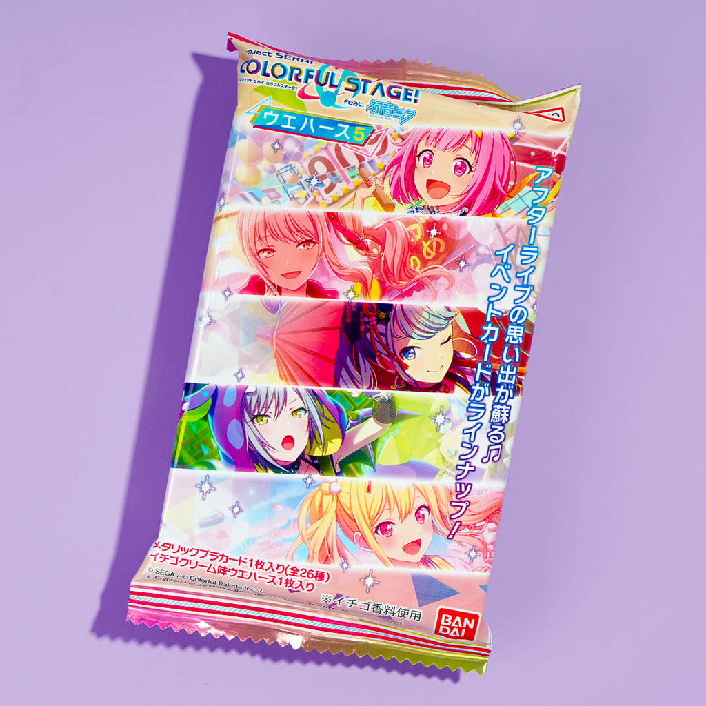 Possible cards from this volume include the Sports Festival Committee set, the Kamiyama High Festival set, the SEKAI Happy New Year set, the Musical Twilight Parade set, and the Doll Festival at the Tenma's set. All character cards are the upgraded 3 and 4 star illustrations, and the special cards are the two stars illustrations with very nice backgrounds and stylized names at the bottom. The cards are pretty sturdy, and the wafer is crisp and sweet.