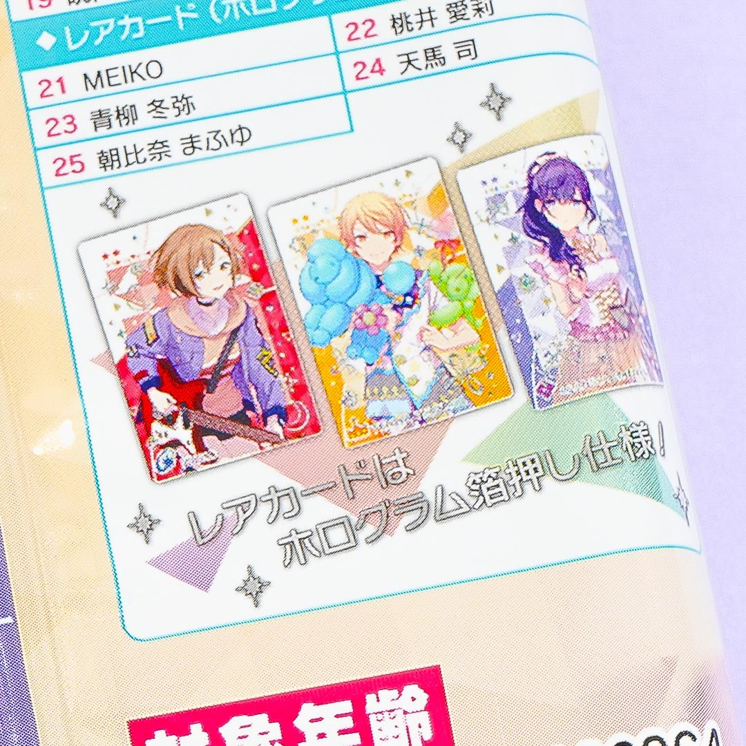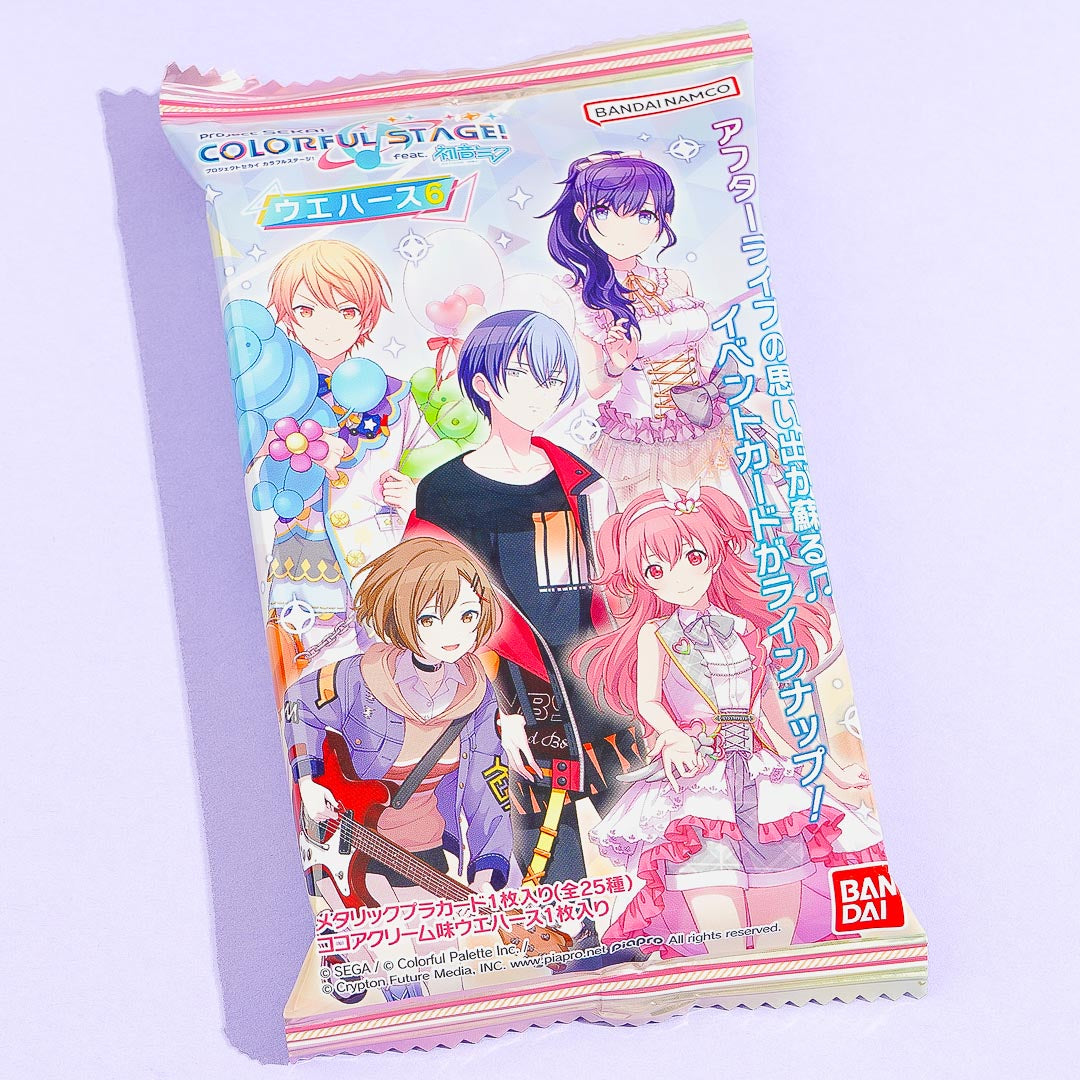 Expand your anime collection while snacking on this chocolate-flavored wafer! This pack comes with a collectible card that features kawaii illustrations from the mobile game Project SEKAI. It's the 6th edition of the "Colorful Stage" series featuring Hatsune Miku.