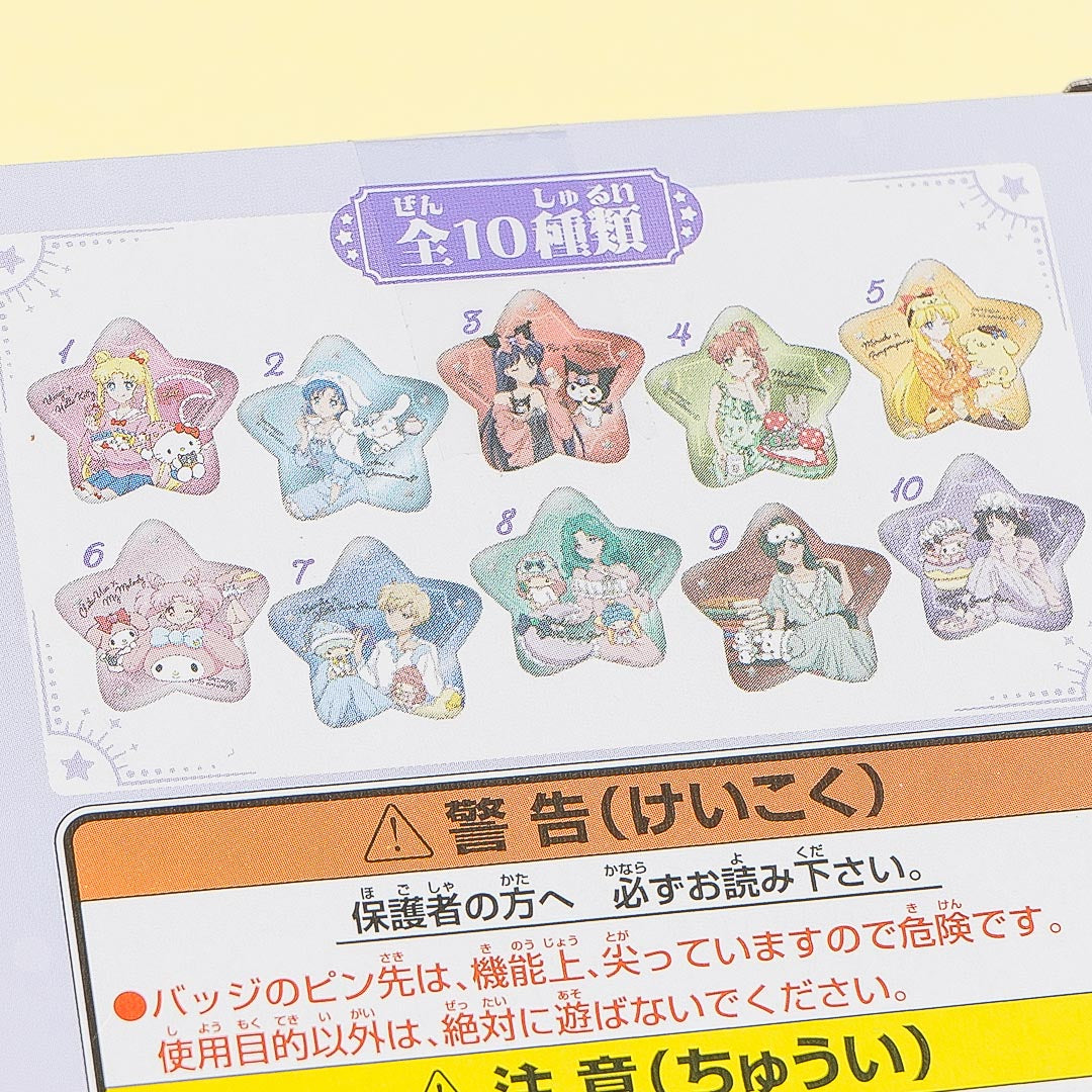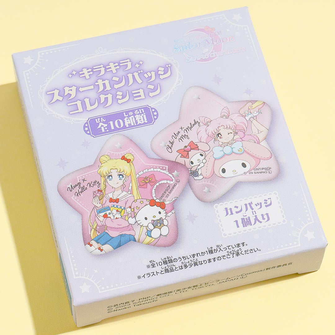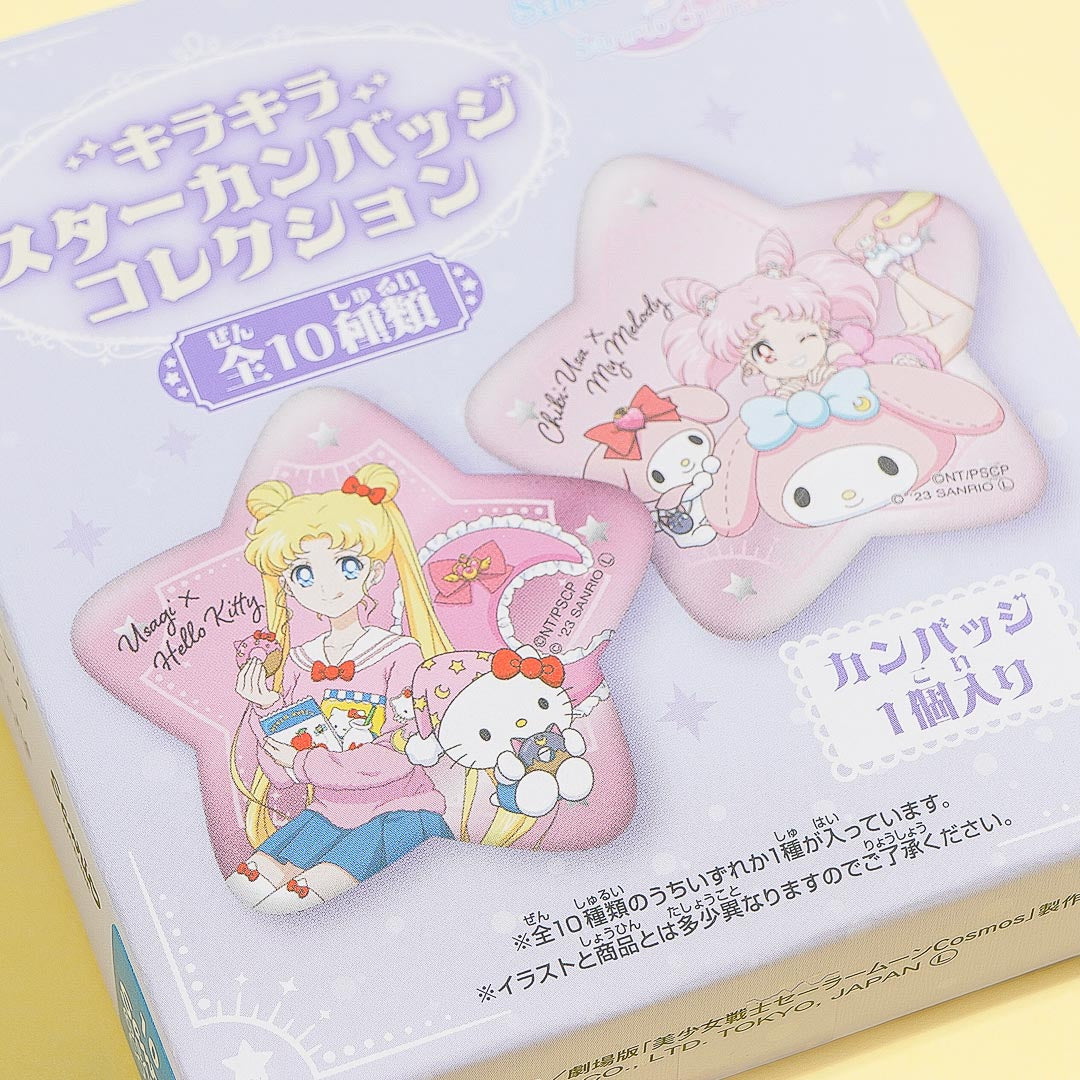 Have fun adding this kawaii star-shaped can badge to your collection! It features a print of a Sailor Moon character hanging out with a cutie from Sanrio. This badge comes from the Pretty Guardian Sailor Moon x Sanrio Characters Sparkling Star Can Badge series.