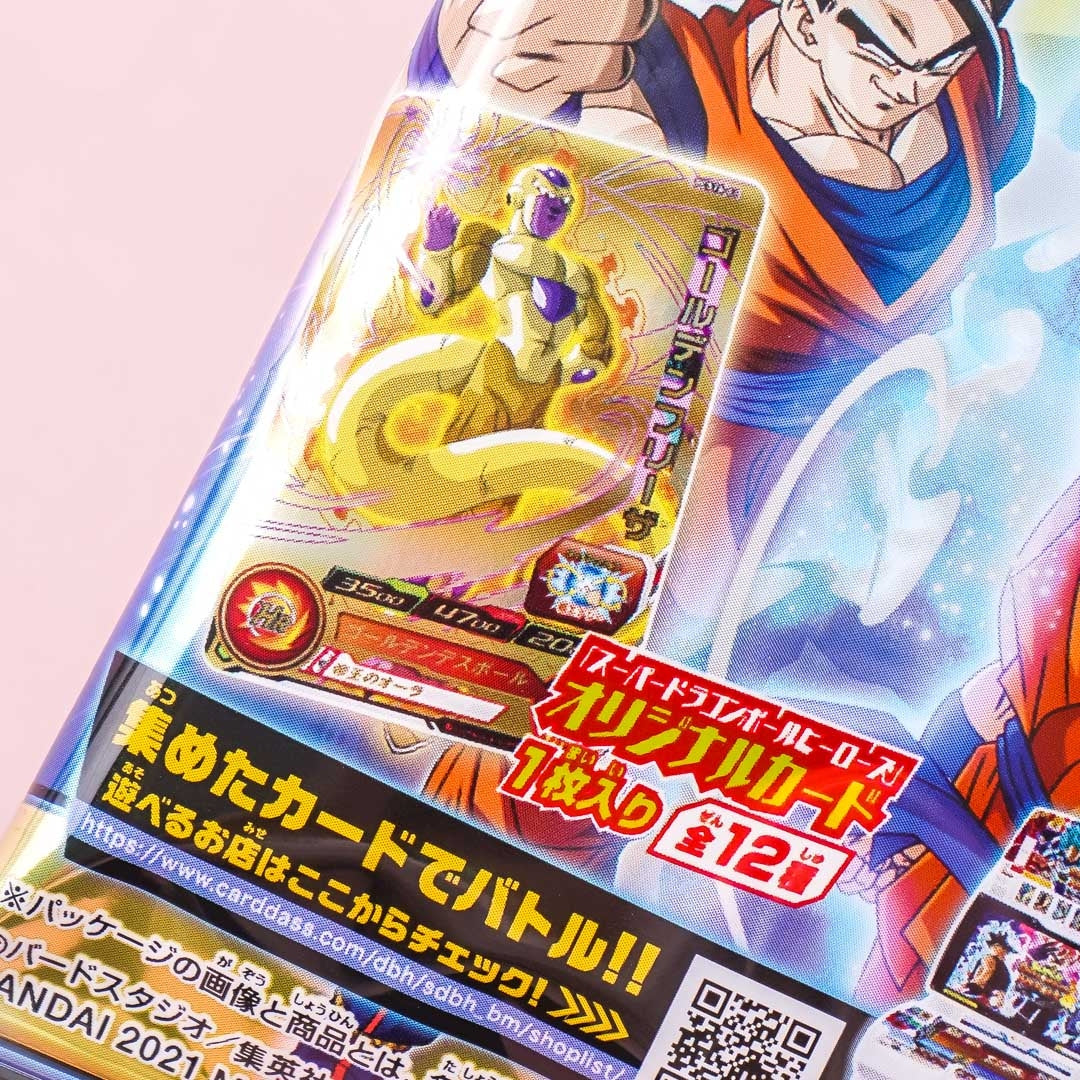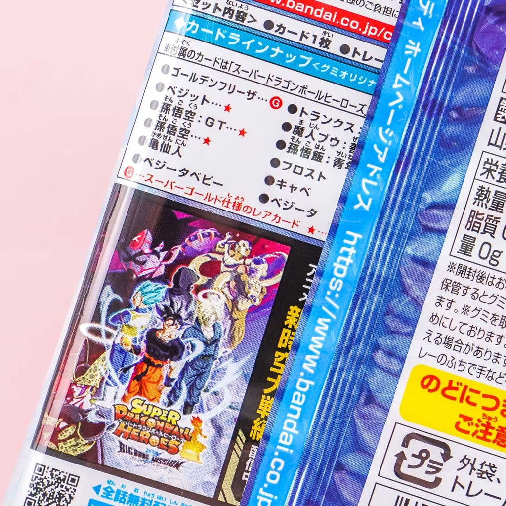 Collect all cards from this fourteenth edition featuring the characters from the popular digital card game, “Super Dragon Ball Heroes.” This set includes a free energy drink-flavored gummy candy. You’ll receive a random character card out of twelve possible designs — four of them have a gold foil stamp, including the rare super gold card character, Golden Frieza!