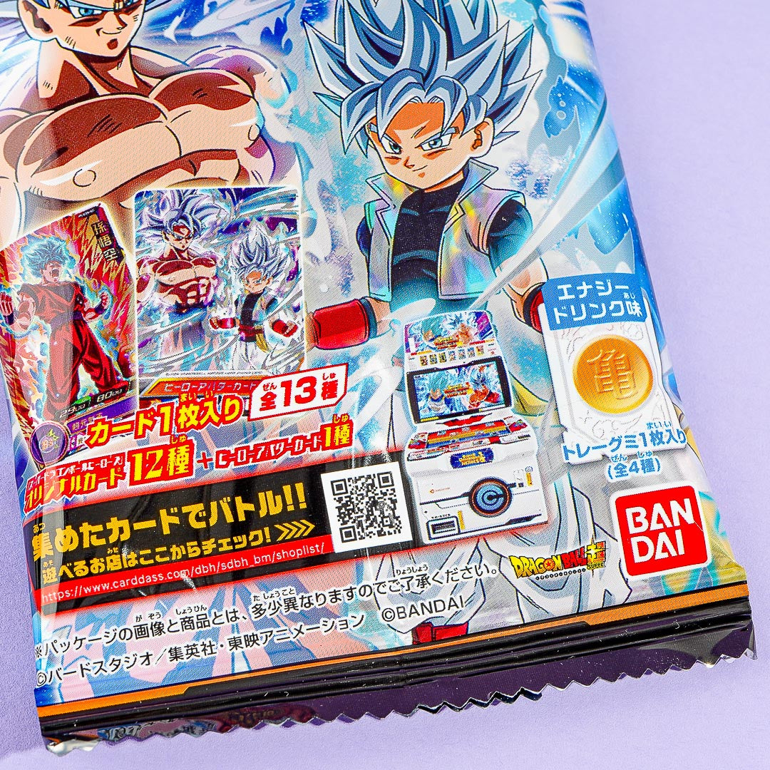 This is the 20th collection of the Dragon Ball series of collectible cards! The card and packaging feature illustrations from the digital card game "Super Dragon Ball Heroes." It even comes with an energy drink-flavored gummy candy!