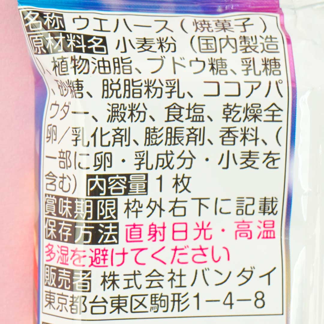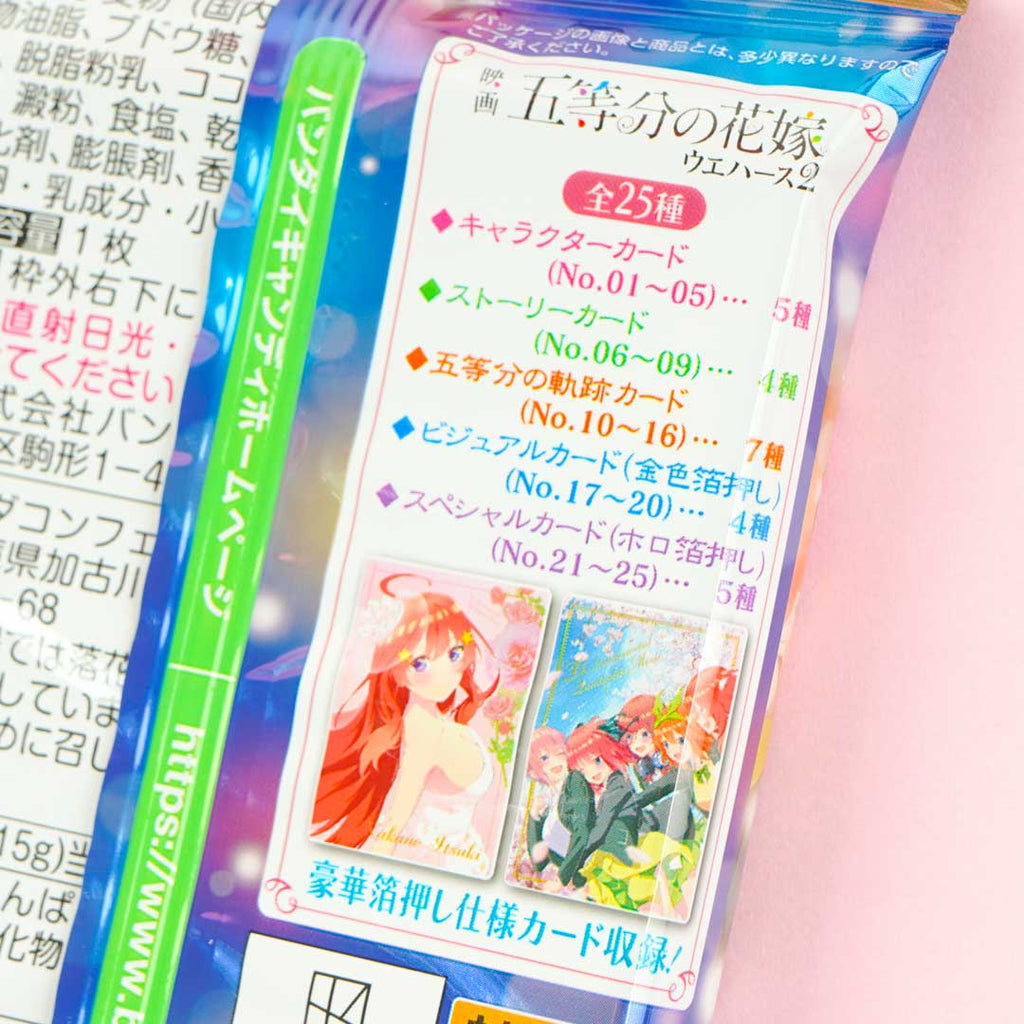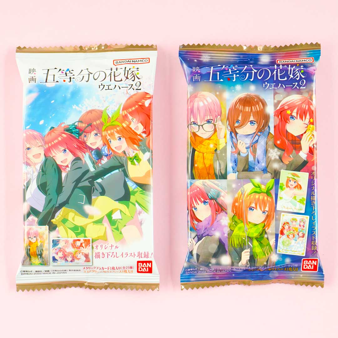 This cocoa cream-flavored wafer pack features prints of the Quintessential Quintuplets! It also comes with a metallic collectible card showcasing the anime series characters. Have fun collecting the cards!