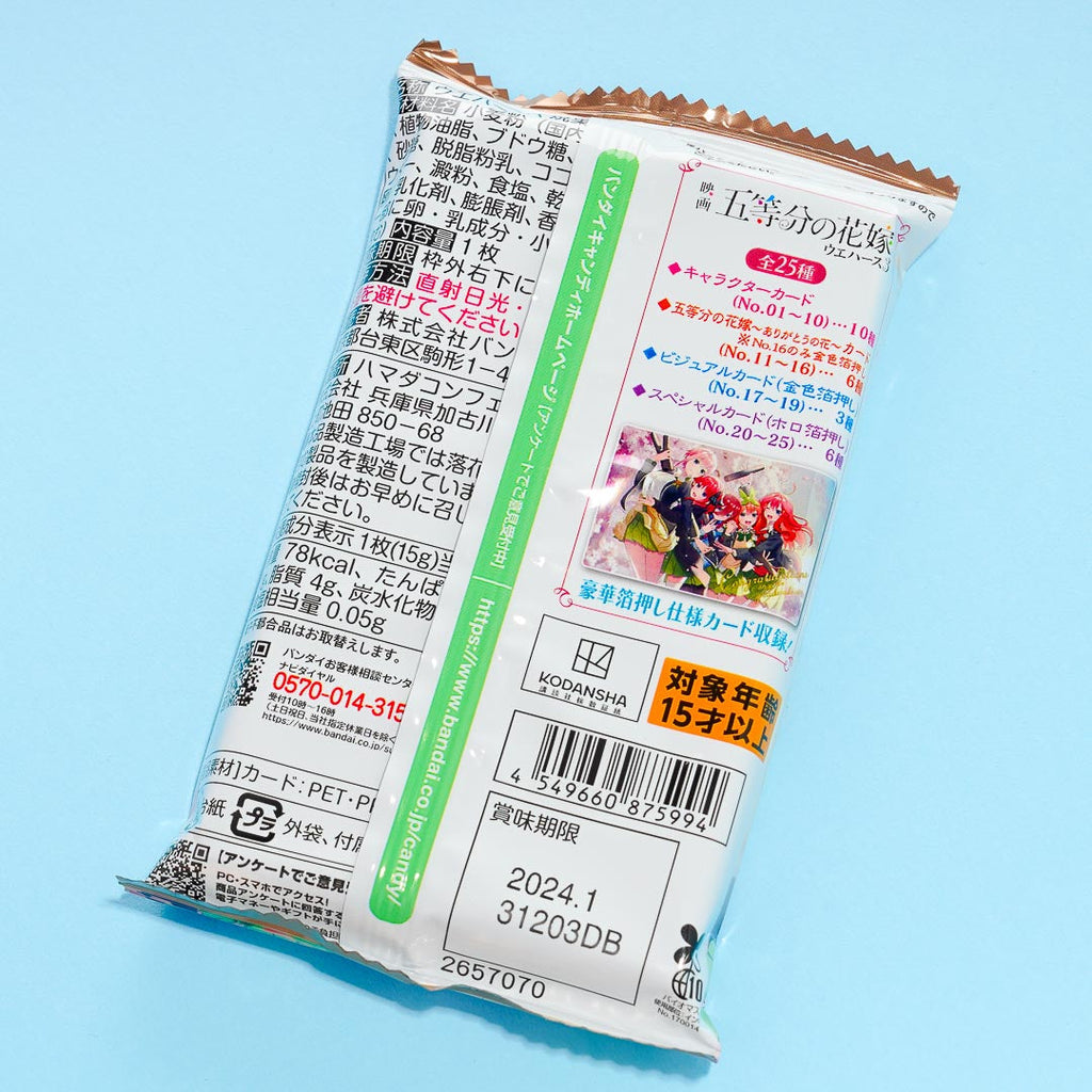 Snack on this tasty cream-flavored wafer while watching the newest anime show. This wafer pack showcases prints of The Quintessential Quintuplets characters. It comes with a collectible card with metallic designs!