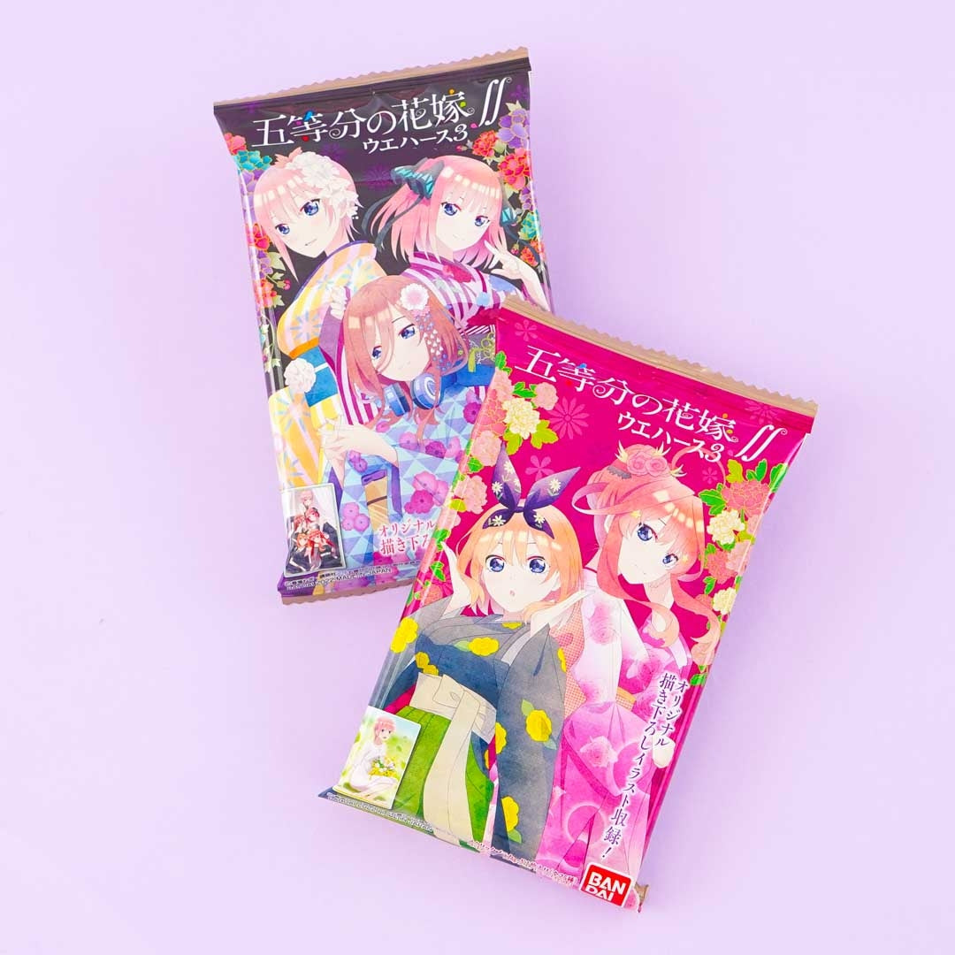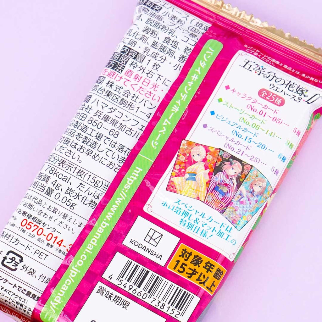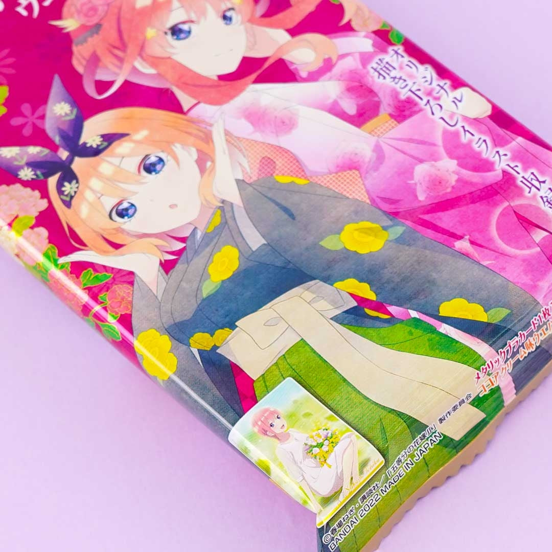 A pack with a “The Quintessential Quintuplets” collectible card with cocoa cream-flavored wafer