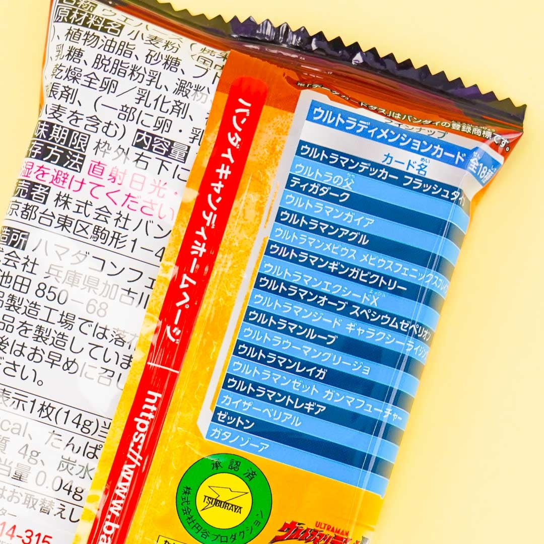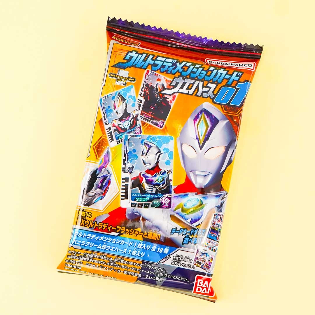 A pack with an Ultraman Decker Ultra Dimension Vol. 1 collectible card and wafer