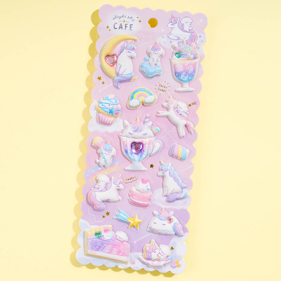 Add a dose of cuteness to your gadgets using these puffy stickers! They have a die-cut design featuring unicorns in the Night Sky Cafe. Some stickers even have a heart-shaped gem!