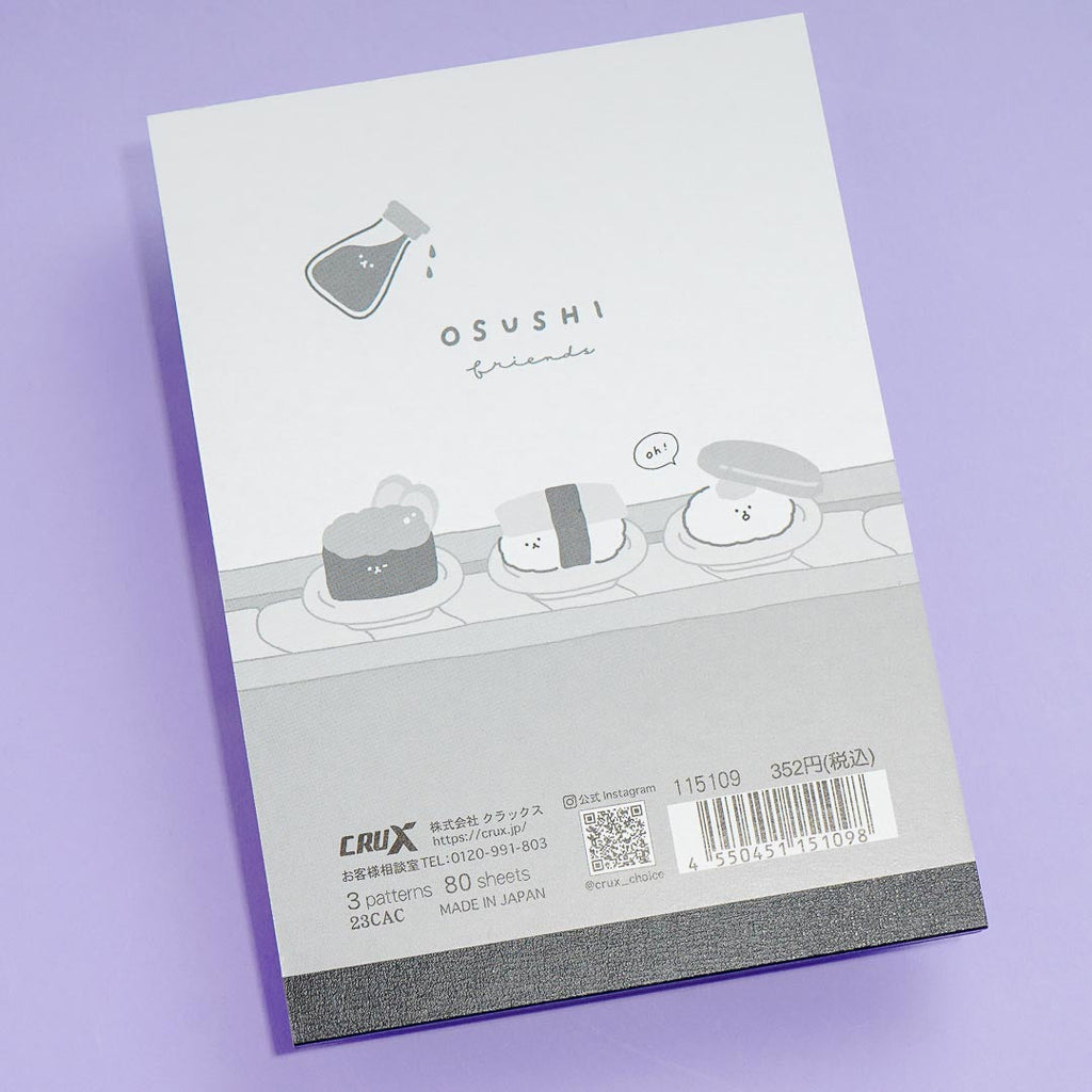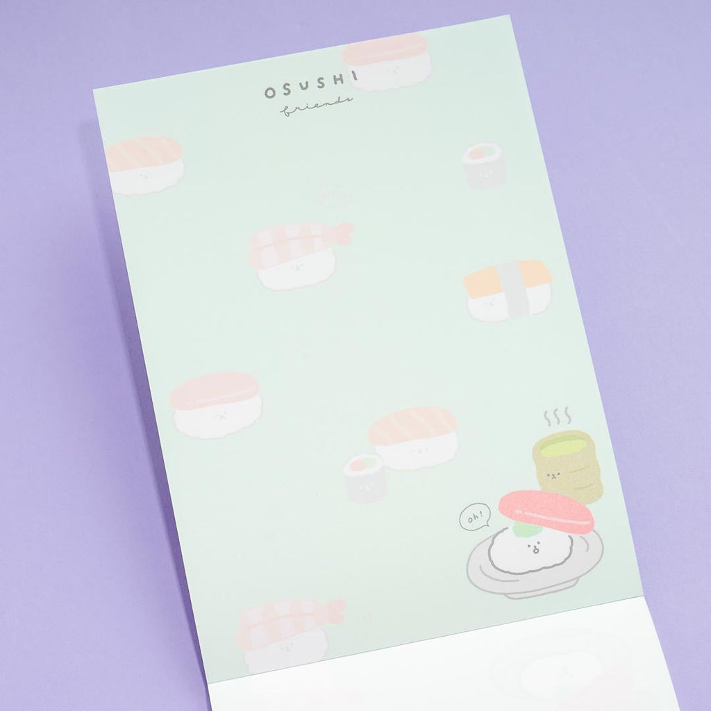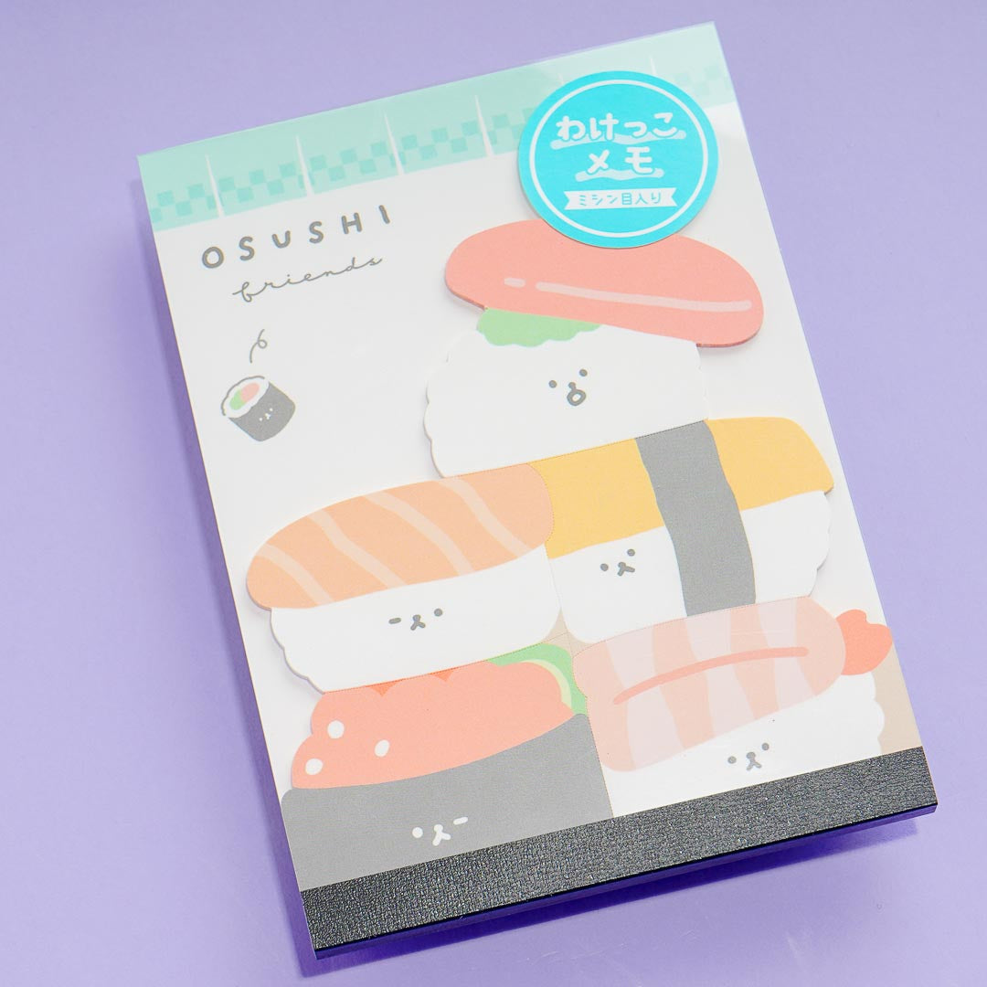Write short sweet notes to your besties using this kawaii memo pad! The front part has die-cut sheets with prints of happy sushi friends! While the rest of the pad has normal illustrated sheets.