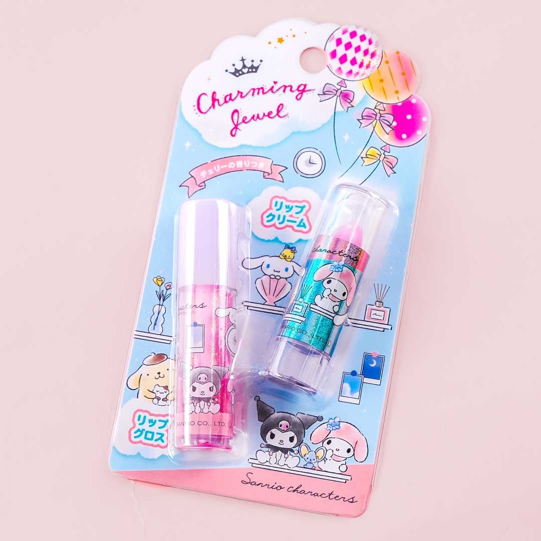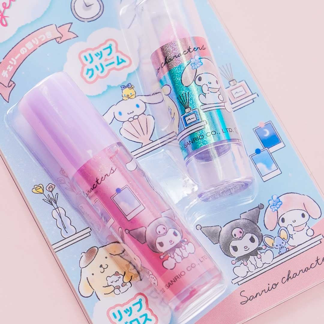 A set of lip gloss and lip balm in kawaii packaging printed with illustrations of Sanrio characters