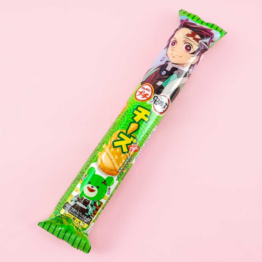 This pack of bite-sized biscuit sandwiches features prints of Tanjiro Kamado from the anime Demon Slayer: Kimetsu no Yaiba. Each biscuit sandwich has cheese cream in between.