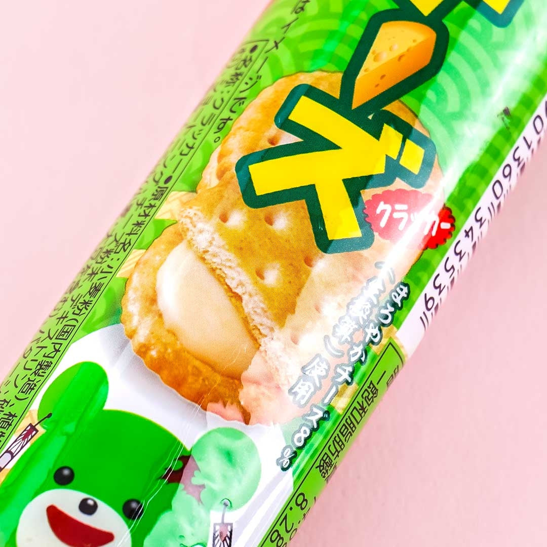 A pack of bite-sized biscuit sandwiches filled with cheese cream featuring prints of Demon Slayer: Kimetsu no Yaiba character Tanjiro Kamado