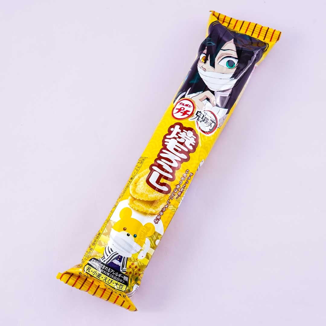 Snack on these mini chips made with corn grits! The slim pack has an illustration of Obanai Iguro, the current Serpent Hashira, and a demon slayer from the iconic Japanese action manga and animé series, Demon Slayer: Kimetsu No Yaiba.