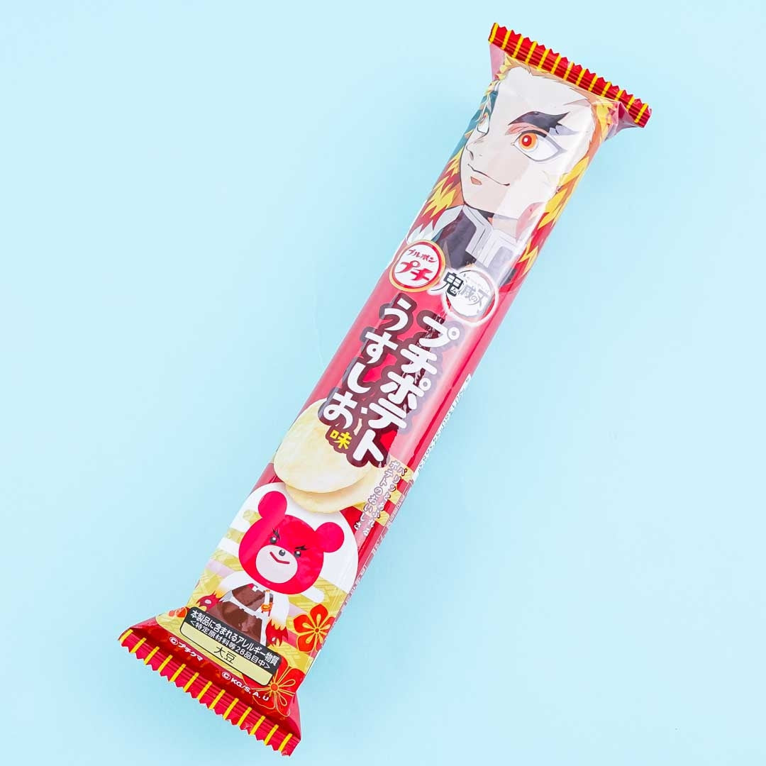 .Have a blast munching on these mini potato chips with a mild savory taste! Each crispy chip is flavored with a mix of bonito and kelp dashi! The packaging has an illustration of Kyojuro Rengoku from the popular Japanese action manga and animé series, Demon Slayer: Kimetsu No Yaiba!