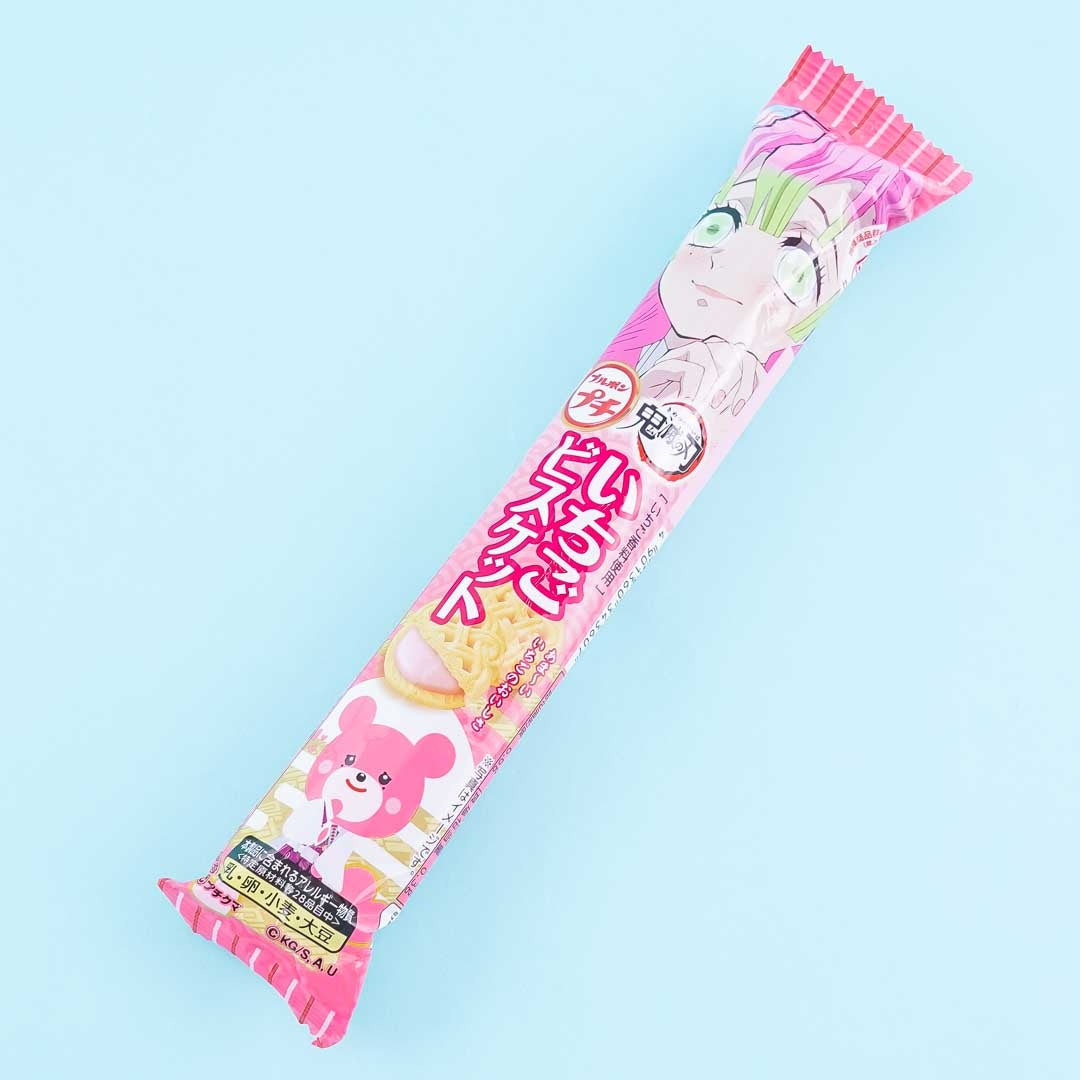 These mini biscuits are made of sweet and sour strawberry cream in between two layers of condensed milk-flavored crackers! Have fun snacking on these petite treats during quick breaks! Its pink packaging matches Mitsuri Kanroji’s hair — the featured character printed on the pack from the popular Japanese action manga and animé series, Demon Slayer: Kimetsu No Yaiba!