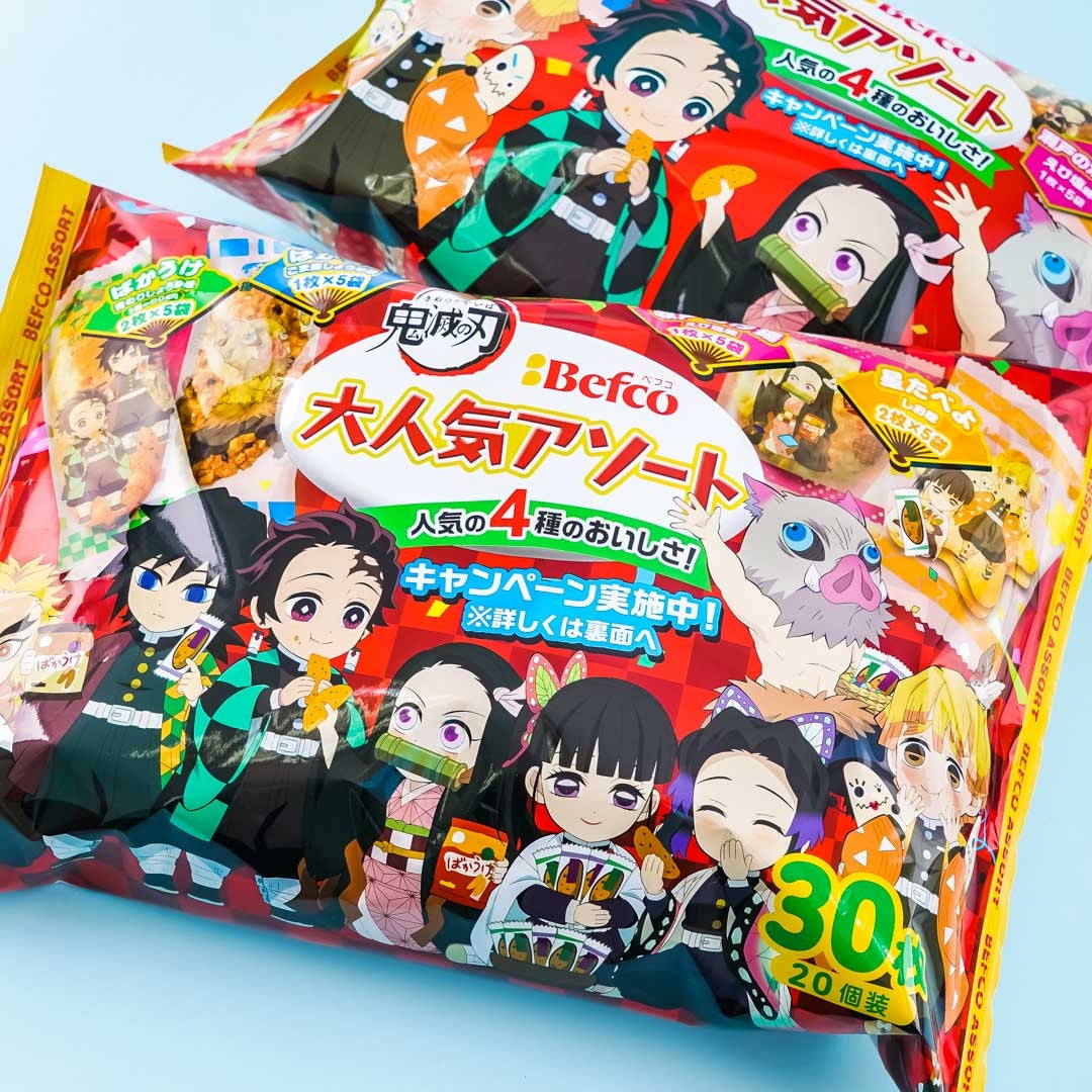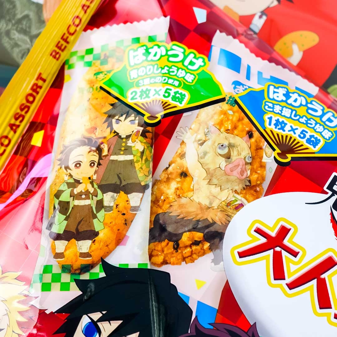 A pack of assorted rice crackers illustrated with Demon Slayer characters